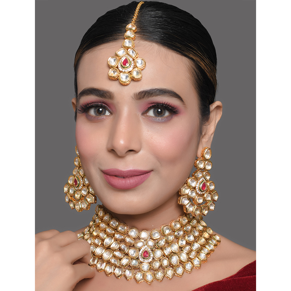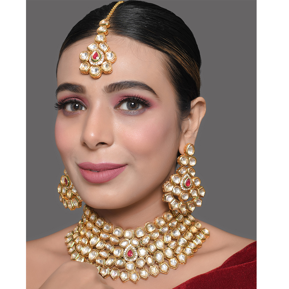 The Mirror Stone Choker Necklace Set with Ruby Center and Matching Tikka is designed to frame the neckline with luminous grandeur. Crafted in golden brass and adorned with white mirror stones, the choker features a striking ruby-toned centerpiece that adds depth and royal character. Paired with a coordinated tikka, this set creates a harmonious bridal silhouette rooted in traditional Indian jewelry artistry. Its extended length and detailed composition make it ideal for ceremonial elegance.