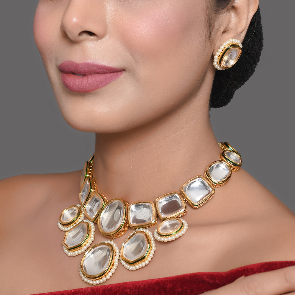 Pair this mirror stone necklace set with silk sarees or embroidered lehengas, and store each piece in a padded jewelry box to preserve mirror clarity and pearl shine.