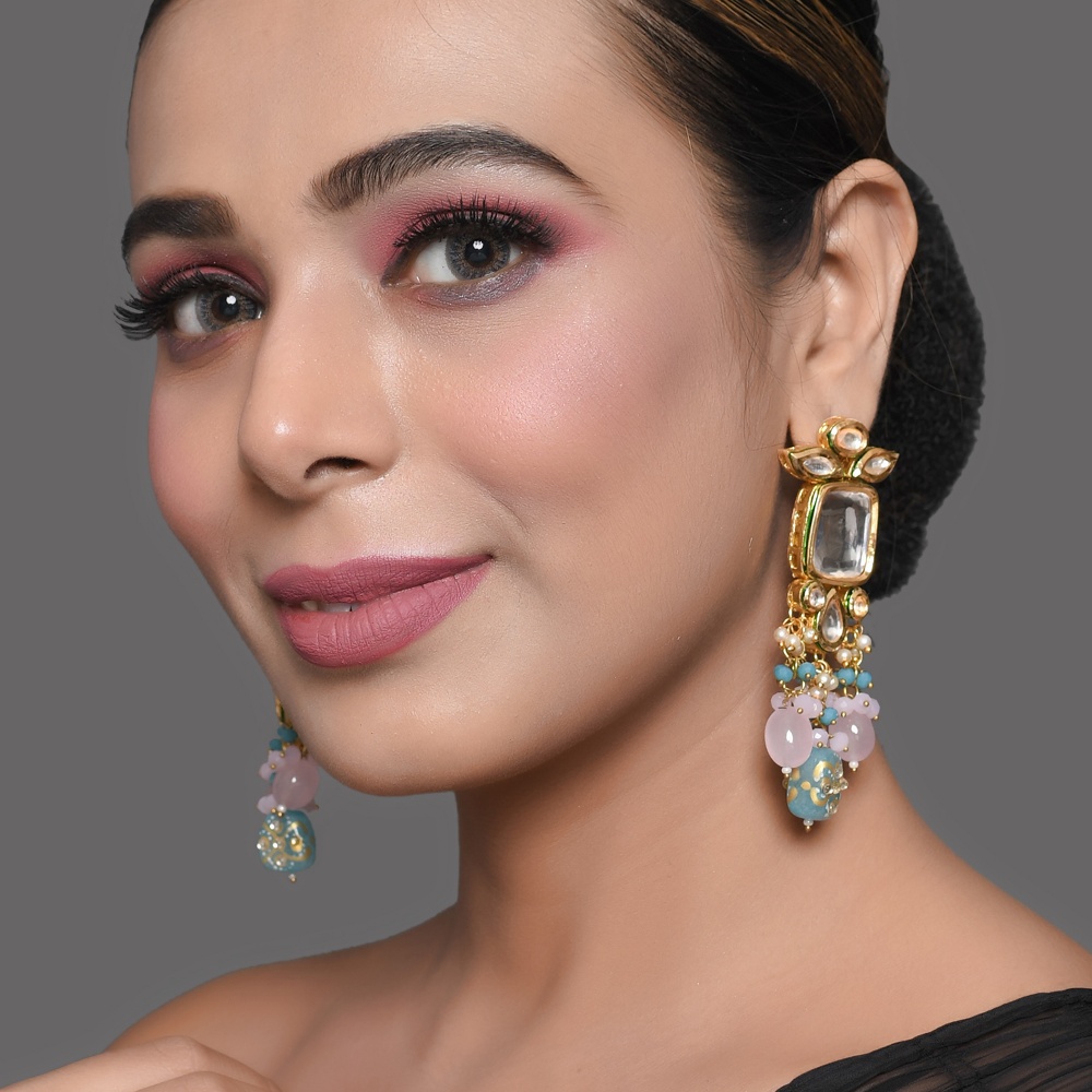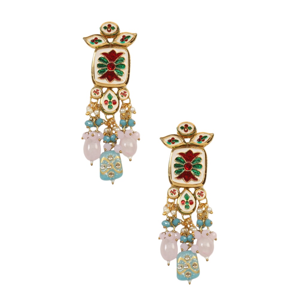 Graceful and expressive, these mirror stone drop earrings are designed to highlight intricate craftsmanship and soft colour detailing. Featuring a structured mirror-style stone top paired with cascading pastel beads and pearl accents, this pair offers elegant movement and a refined festive appeal.
