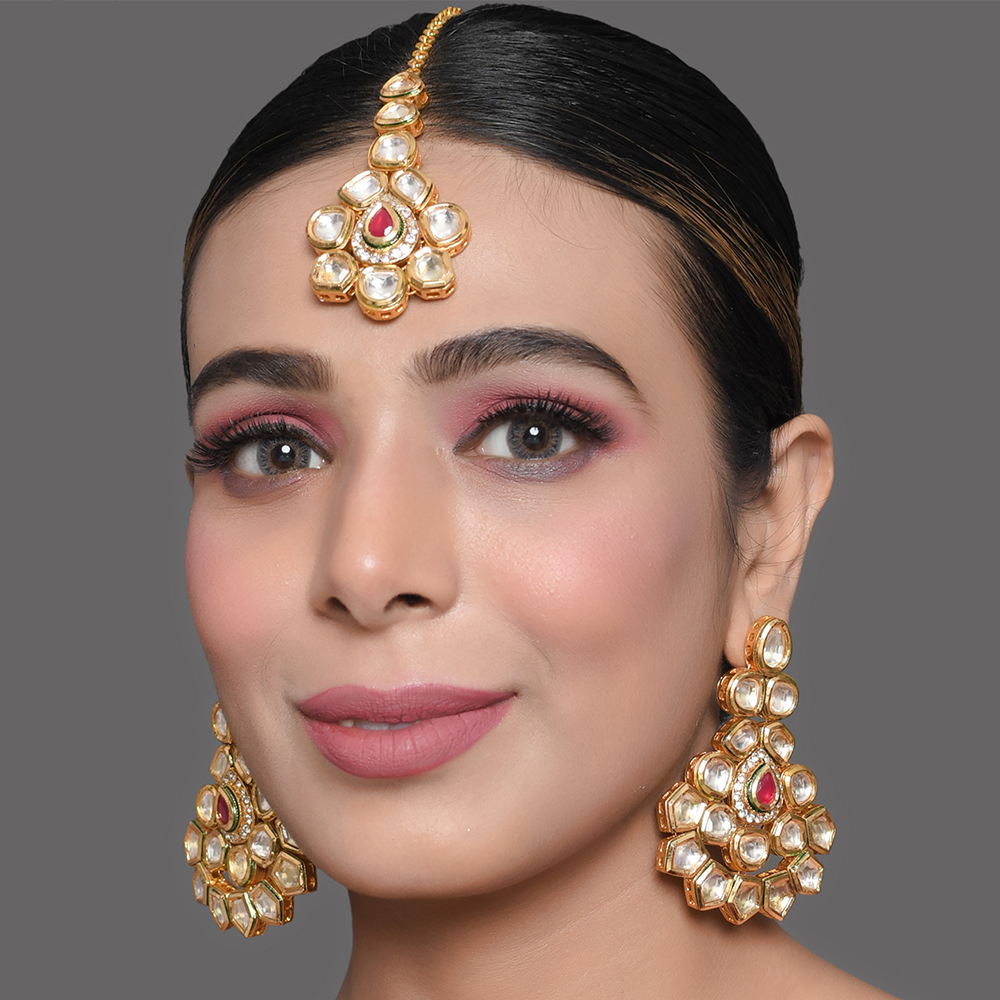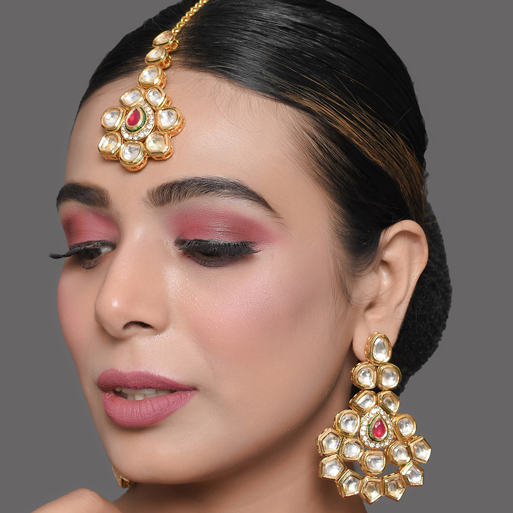 The Mirror Stone Earrings and Maang Tikka Set with Ruby Accent is a coordinated jewelry ensemble designed to elevate traditional attire with luminous charm. Crafted in golden brass and embellished with white mirror stones, the set is highlighted by rich ruby-toned accents that add regal depth. The harmonious pairing of statement earrings and a matching maang tikka creates a balanced bridal silhouette. This handcrafted set reflects timeless Indian artistry blended with festive grandeur.