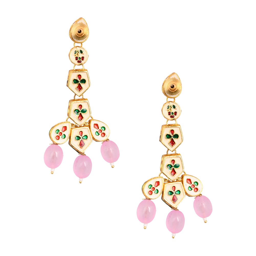 These earrings are handcrafted using traditional techniques and feature a unique cascading arrangement of mirror stones and pink beads, ensuring each pair is one-of-a-kind and durable.