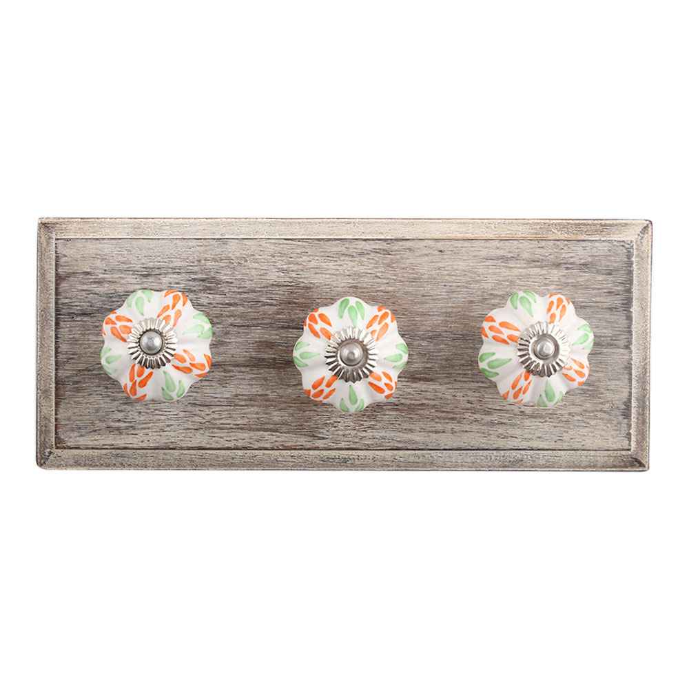 Mixed Leaf Ceramic Wooden Hook. A Perfect Complement to the Soft Tone of the Wood are these White Traditional Hat Coat Hook Made of Genuine Porcelain and Brass. It can be use to Hang Jewellery, Leashes, Towels, Scarves, Light Weight Sweaters, Caps Etc.