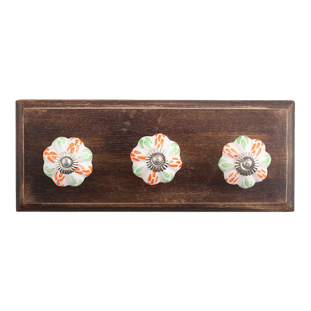 Mixed Leaf Ceramic Wooden Hook. A Perfect Complement to the Soft Tone of the Wood are these White Traditional Hat Coat Hook Made of Genuine Porcelain and Brass. It can be use to Hang Jewellery, Leashes, Towels, Scarves, Light Weight Sweaters, Caps Etc.