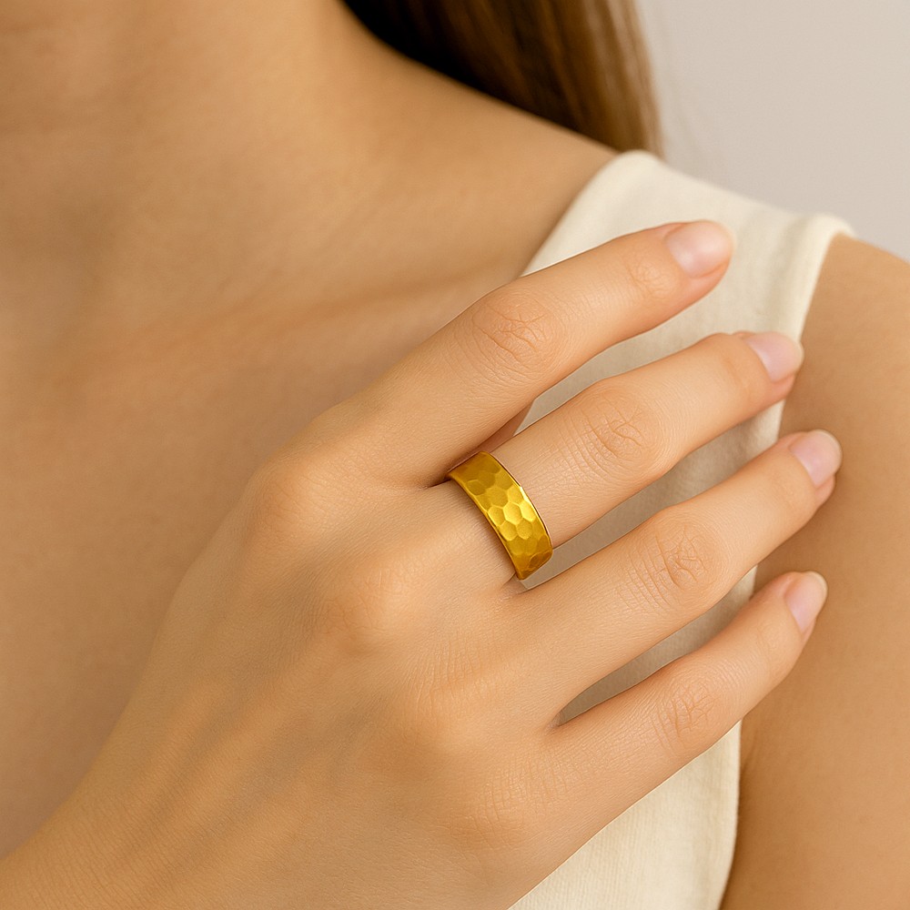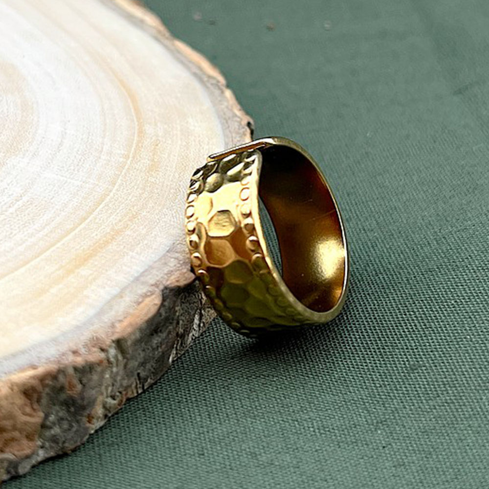 The Modern 18K Gold Plated Hammered Adjustable Wide Ring brings raw texture and refined shine into perfect balance. Crafted from a strong stainless steel base and finished with radiant 18K gold plating, its hammered surface catches light with subtle variation. The wide band creates a bold presence without feeling heavy. Adjustable by design, it delivers comfort while making a clear style statement.