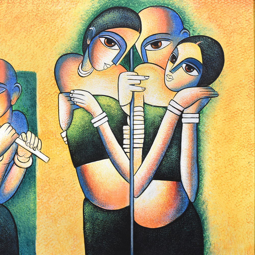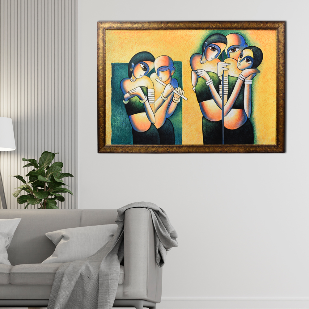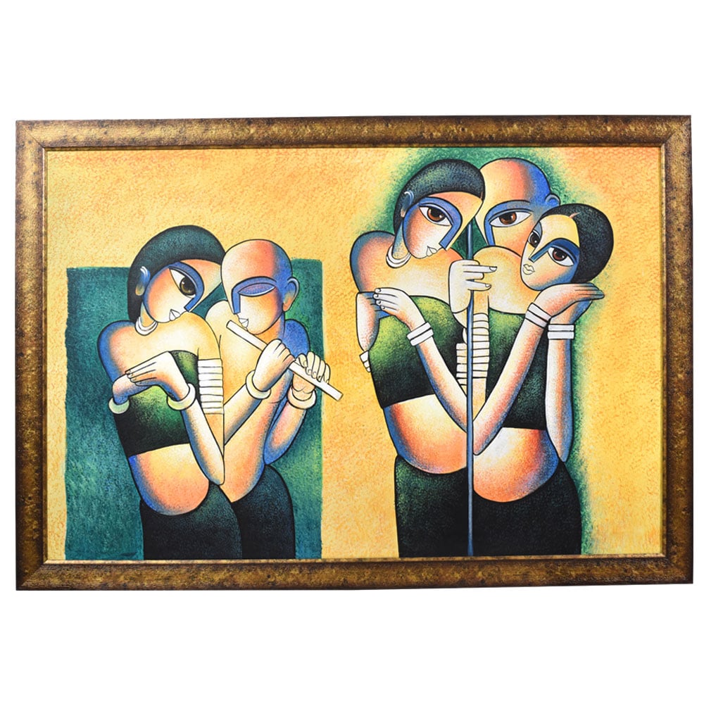 Immerse yourself in the timeless love story of Radha and Krishna with this stunning modern art canvas painting. Masterfully crafted, this vibrant work of art will transport you to the lush, mystical landscapes of ancient India, infusing your space with a sense of spiritual wonder. This captivating canvas painting is more than just a work of art - it's a gateway to a world of enchantment and divine love. Imagine waking up each morning to the sight of Radha and Krishna, their gentle embrace a constant reminder to embrace the beauty and wonder in your own life. Whether you're a seasoned art collector or simply seeking to infuse your home with a touch of timeless elegance, this modern interpretation of the iconic Hindu deities is sure to captivate and inspire.