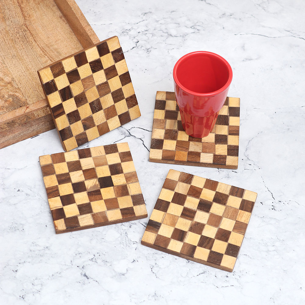 Crafted from sustainable wood, these coasters are not only durable but also environmentally friendly. The modern check pattern provides a sleek look that fits seamlessly with any decor, and their robust construction ensures they will last for years.