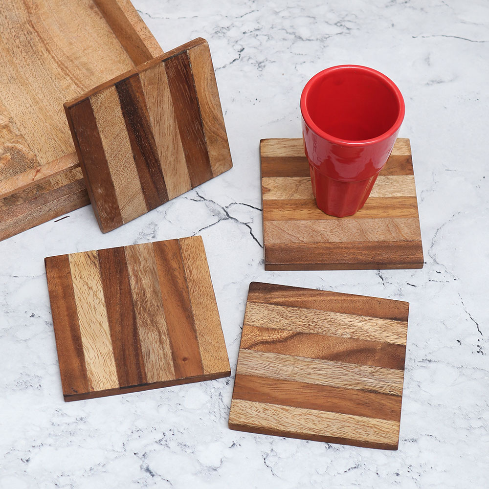 The finest Pack of 4 wooden coasters crafted with utmost precision and care, the Best Wooden Coaster Set for your home. Each coaster in this exquisite collection is handmade by highly skilled Indian artisans, renowned for their craftsmanship. Made from high-quality wood, these square-shaped coasters feature a captivating brown and dark brown pattern, boasting an antique finish that adds a touch of elegance to any space. Not only are these coasters a functional addition to your home or office, but they also serve as stunning decorative pieces. Their intricate design and attention to detail make them a striking conversation starter. Use them to protect your surfaces from water, tea, juice, or coffee stains, whether at home, in the office, or at a restaurant, hotel, or cafe. The Wooden Tea Coaster Set is a versatile and practical solution to keep your table tops pristine. Furthermore, these coaster sets make exceptional gifts for your loved fours on special or festive occasions.