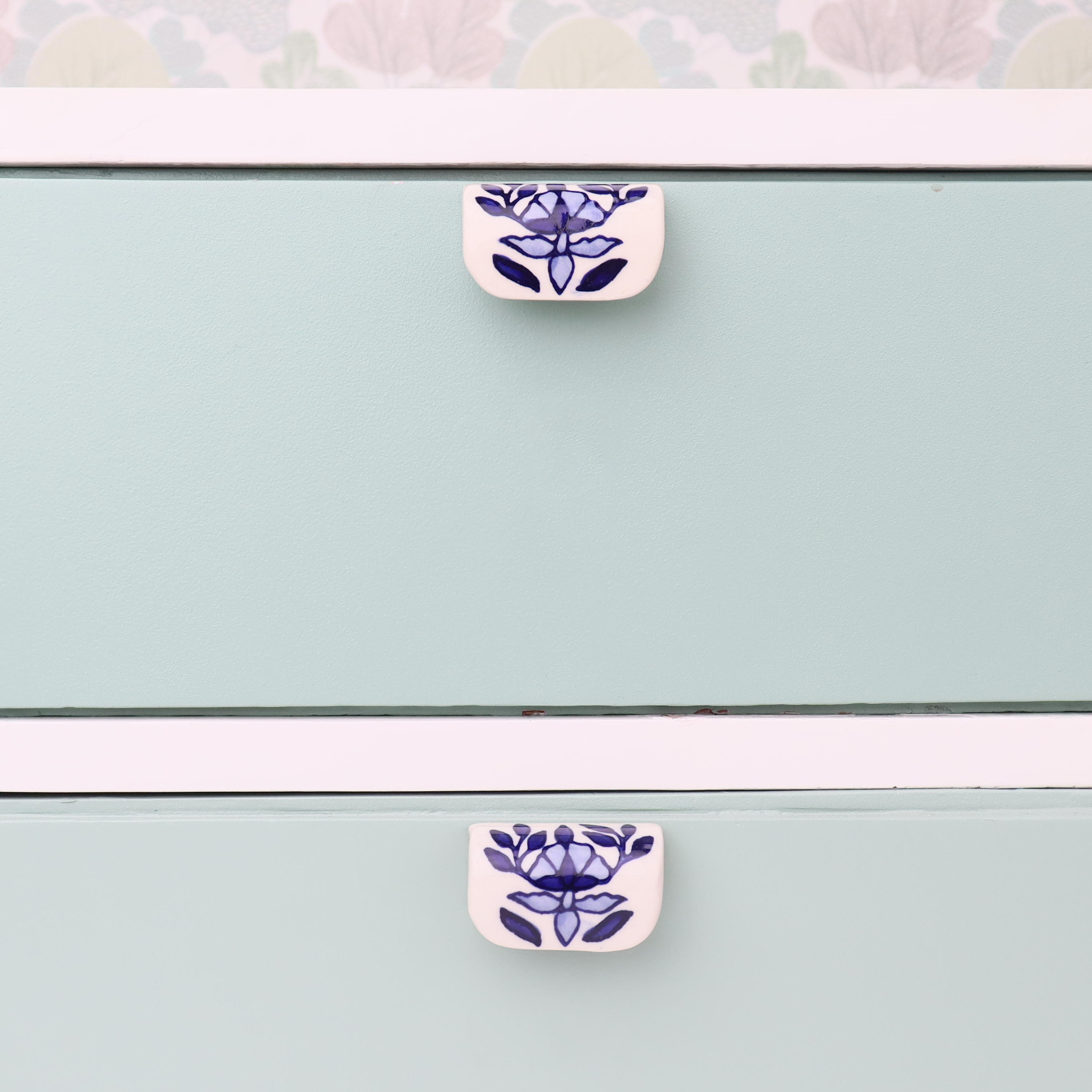 Due to its small size, the Blue Leaf Floral Drawer Handle is perfect for smaller drawers or cabinet doors. If you're looking to update a wardrobe, small dresser drawers, or nightstand, this handle provides just the right size and style to make a statement without overpowering the design of your furniture.