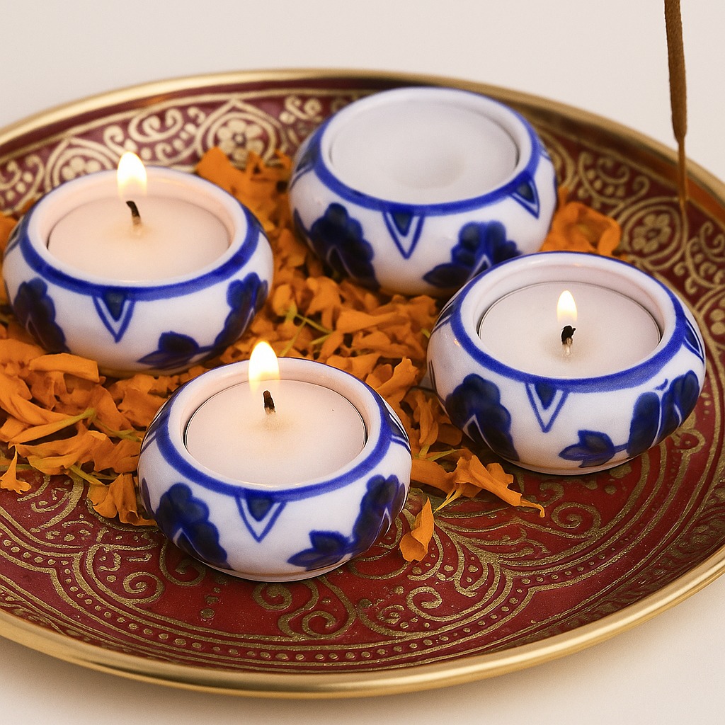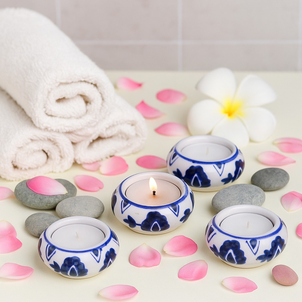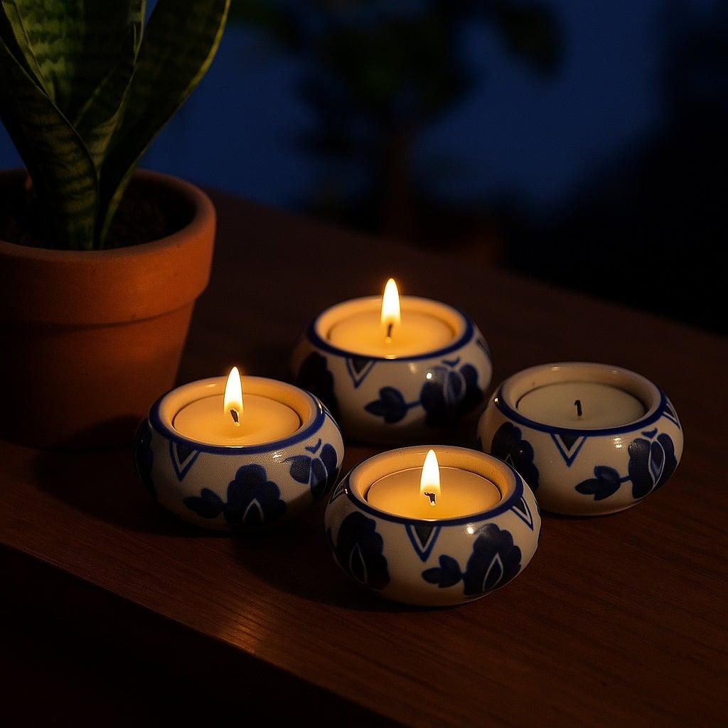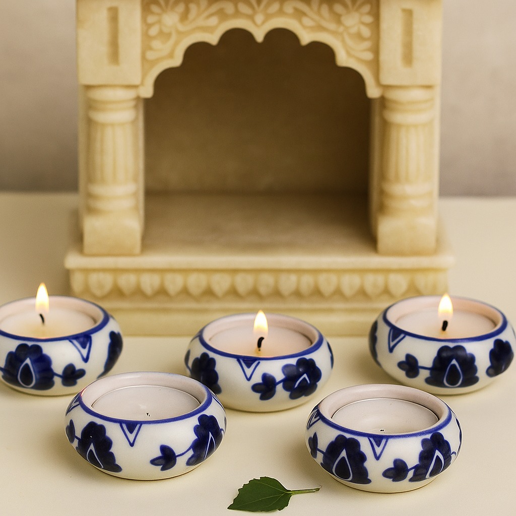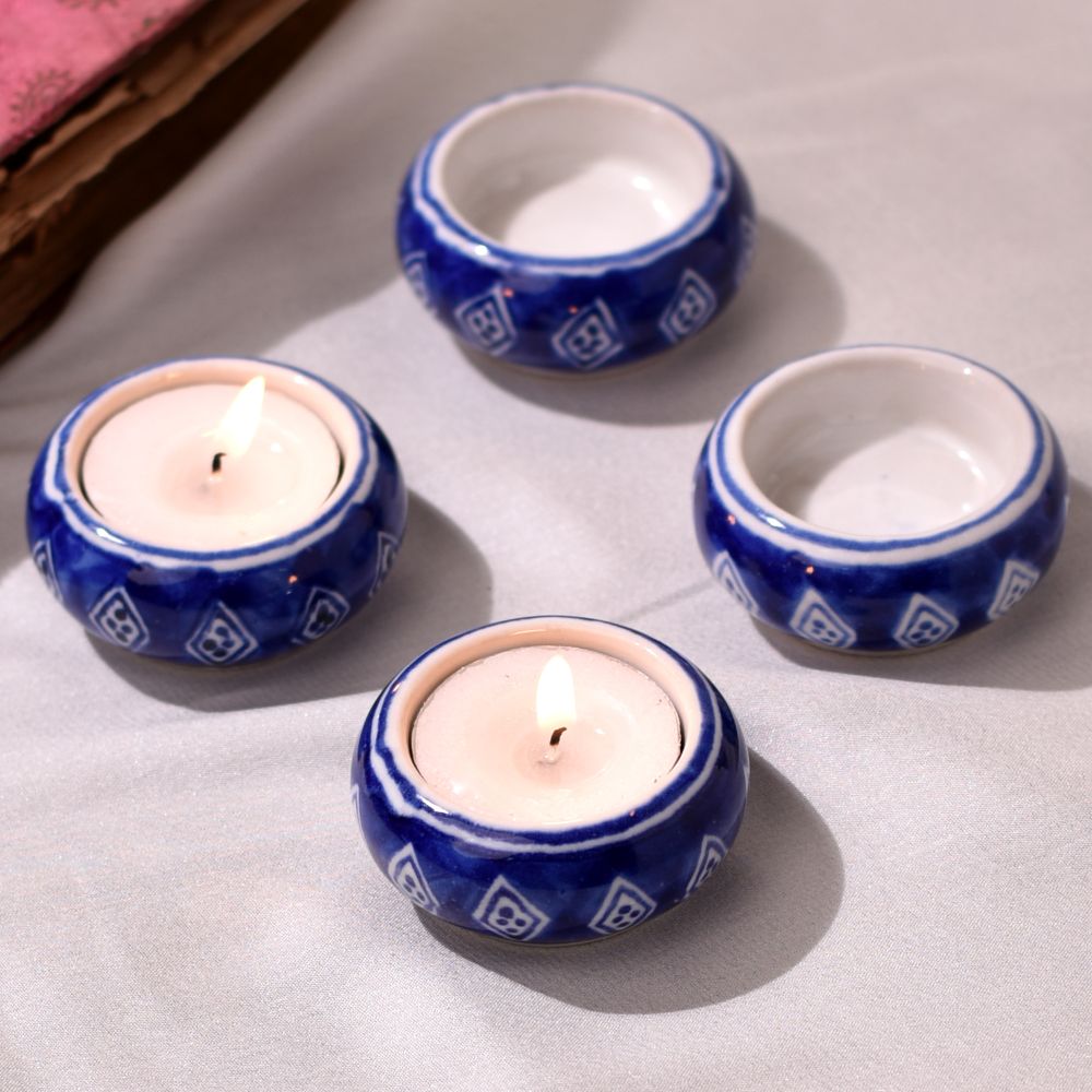 Buy a Ceramic Tea Light Holder online that is a true testament to the mastery of Indian artisans. Handcrafted with precision and love, this high-quality ceramic holder boasts a captivating blend of serene white and calming blue hues, adorned with an intricate diamond pattern. Each piece encapsulates the dedication and artistry of skilled craftsmen, making it a unique and timeless decor item. Tea light holders have long been cherished for their ability to infuse spaces with a warm and gentle glow. Whether gracing your home, restaurant, cafe, shop, or hotel, this holder promises to elevate any setting. Imagine the ethereal radiance emanating from the delicate flames, setting the perfect backdrop for cherished moments shared with loved ones. Embrace its charm during special occasions, creating an enchanting atmosphere that lingers in hearts. The Ceramic Tea Light Holder makes for an ideal gift, adding an extra touch of elegance to special, festive, or auspicious celebrations.