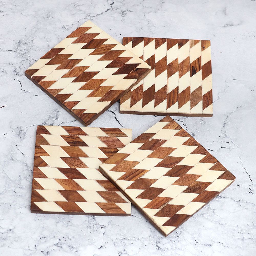 Indianshelf.com for bulk/wholesale orders.Indianshelf.us for personal purchases.Enhance your home decor while safeguarding your furniture with the Modern Decorative Wooden Coasters. Made from high-quality wood and featuring a sleek, contemporary design, these coasters combine style with practicality. This set of 4 coasters is perfect for protecting your tables from water rings, spills, and stains.