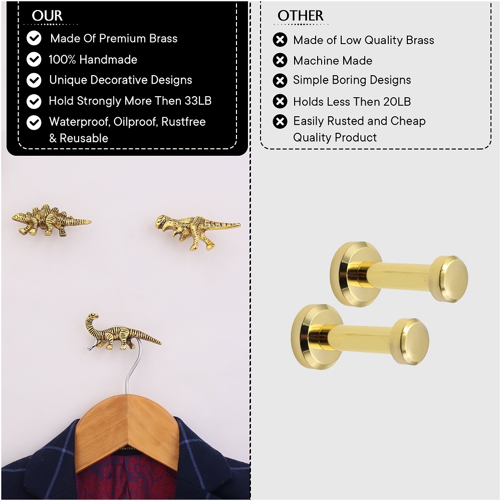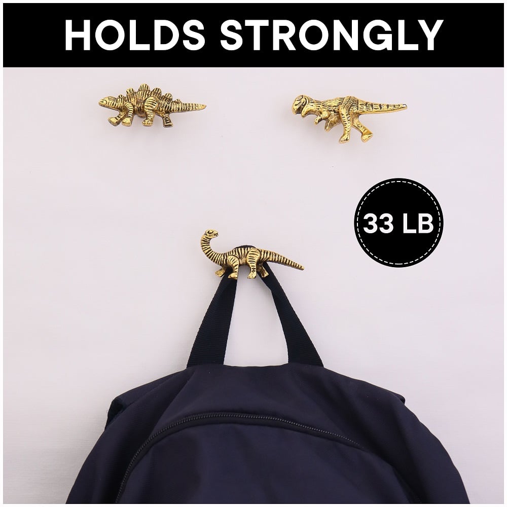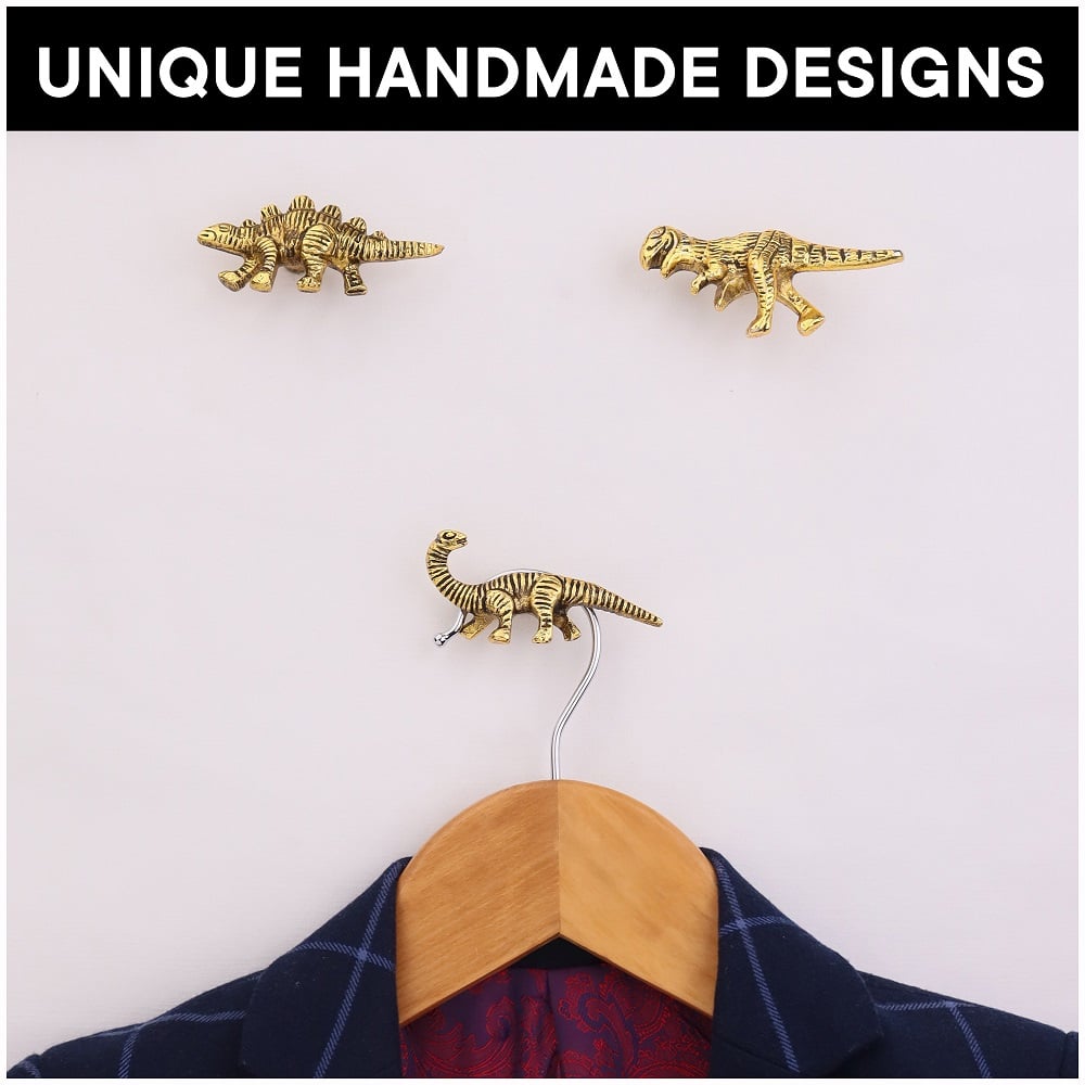 • Modern Dinosaur Aluminium Golden Heavy Duty Wall Hooks-Pack of 3