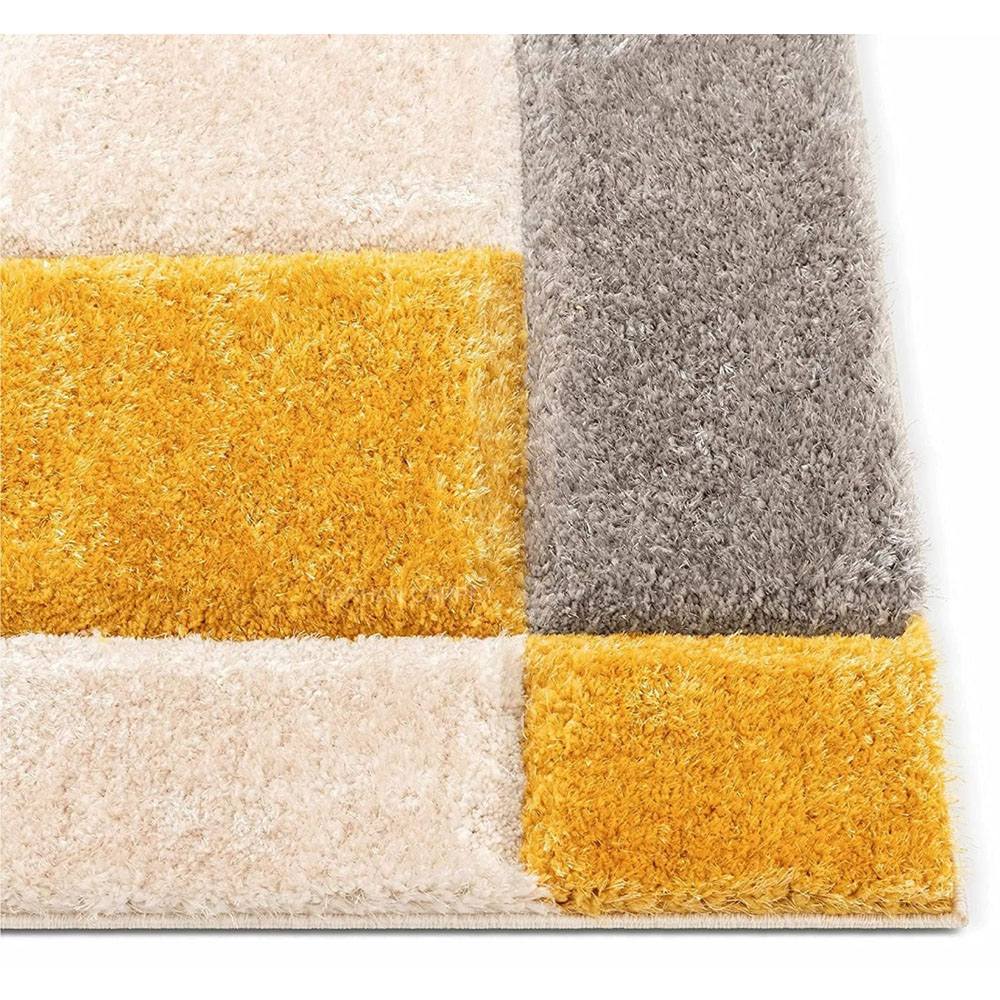 This rug combines the elegance of ivory, the warmth of gold, and the cool tones of silver in a stylish geometric block layout.