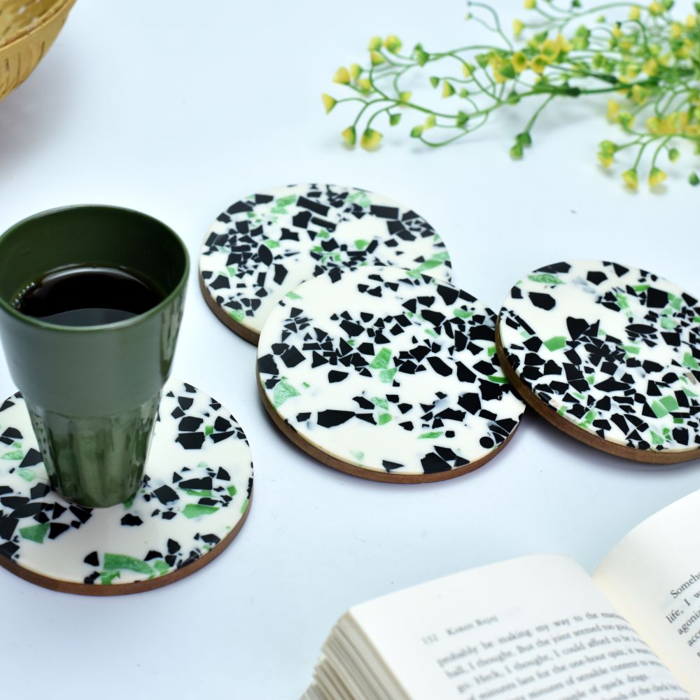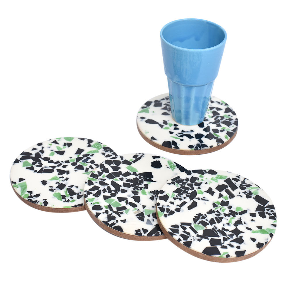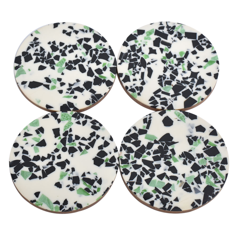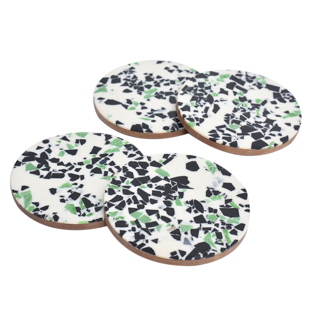 Modern Green Wood And Resin Terrazzo Round Coasters In Set Of 4