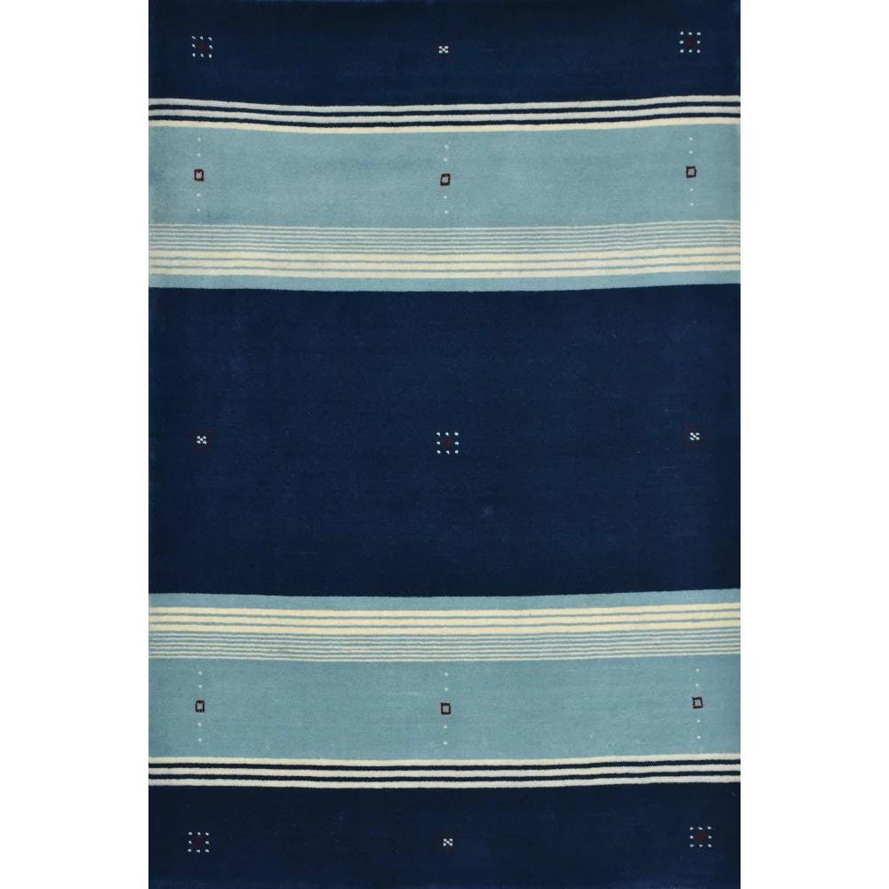 This hand knotted wool rug features a calming minimalist design with a rich navy blue base, accented by sky blue bands and subtle woven symbols. Inspired by modern Gabbeh styles, this rug brings a sense of peace, order, and grounding to any contemporary, Scandinavian, or Japandi-style interior. Color: The color palette evokes a sense of tranquility and balance, featuring: Deep navy blue Soft sky blue Cream/ivory fine lines Accents of maroon and white in symbolic details Design: This rug blends modern minimalism with traditional Gabbeh inspiration. Two broad horizontal blue bands bordered with cream stripes Subtle hand-knotted motifs (dots, crosses, and diamond outlines) Balanced spacing for a clean, uncluttered aesthetic Perfect for bedrooms, meditation spaces, reading nooks, or minimalist living rooms Pattern: Symmetrically aligned horizontal bands Subtle tribal symbols that echo traditional Gabbeh themes Clean layout with breathing space between motifs Understated elegance through minimalist detailing RUG PROCESSING HAND KNOTTED RUGS This is a premium hand knotted rug, where every knot is tied by hand by skilled artisans using centuries-old techniques. MADE TO ORDER 45 WEEKS PROCESSING TIME Each rug.