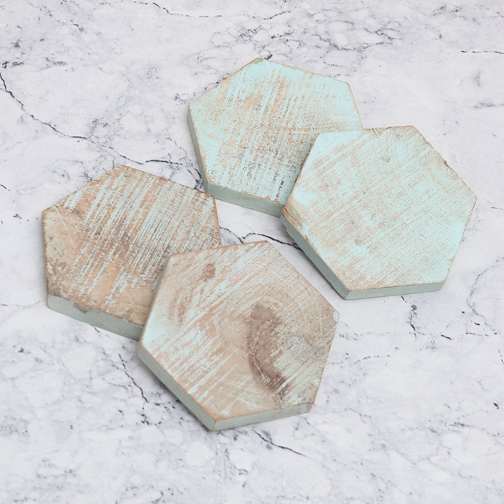 This exquisite Pack of four wooden coasters is handcrafted with utmost precision and care by skilled Indian artisans. These wooden tea coasters are a perfect blend of elegance and functionality, designed to enhance your living or working space. Made from high-quality wood, each coaster features a captivating hexagon shape that adds a unique touch to its overall appeal. The brown and sky blue coloured pattern intricately adorns the surface, creating a visually stunning contrast. With an antique finish, these coasters possess a timeless charm, making them a striking decorative piece for your home or office. Not only are these coasters visually appealing, but they also serve a practical purpose. Use them to hold water, tea, juice, or coffee glasses, whether at home, office, restaurant, hotel, or cafe. They effectively safeguard your surfaces from stains, providing both protection and style. This set of best wooden coasters is not only a functional addition to your space but also an ideal gift for your loved fours on special or festive occasions.
