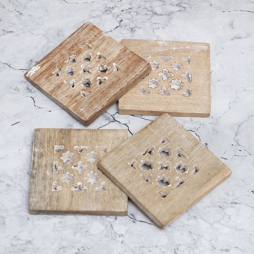 Buy a beautiful Pack of four wooden coasters online that is a true epitome of elegance and craftsmanship. Handmade by highly skilled Indian artisans, these square-shaped coasters are crafted with the utmost care and precision using high-quality wood. Each coaster features intricate jali engraving, adding a touch of antique charm to its overall design. Finished in a rich and alluring antique brown, these wooden tea coasters not only serve their functional purpose but also double as decorative pieces for your home or office. They effortlessly elevate any space, blending seamlessly with various decor styles. Place your water, tea, juice, or coffee glasses on these coasters to protect your surfaces from unsightly stains, whether you\'re at home, the office, a restaurant, hotel, or cafe. These coaster sets make for the best wooden coasters, thanks to their superior craftsmanship and durable construction. They are also an ideal gift for your loved fours on special or festive occasions, showcasing your impeccable taste and thoughtfulness.