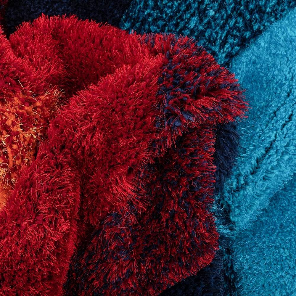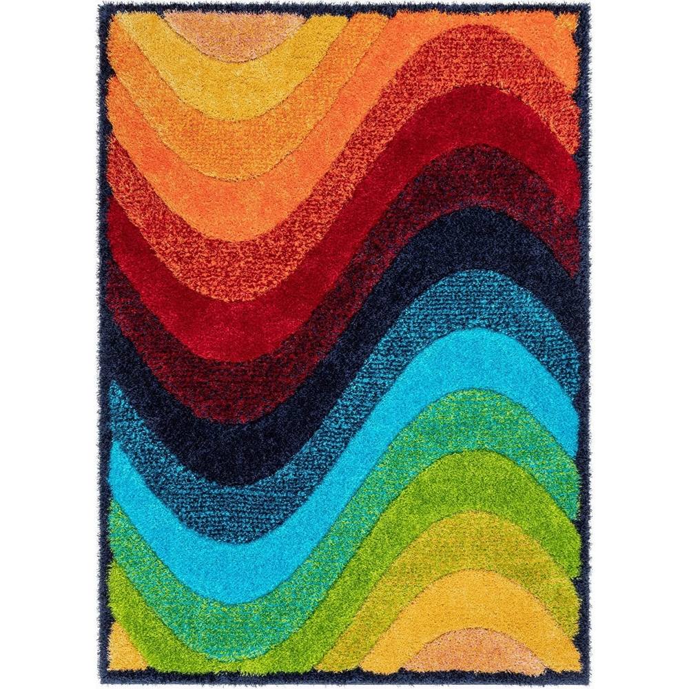• Hand-tufted wave design blending red, blue, green, and orange hues