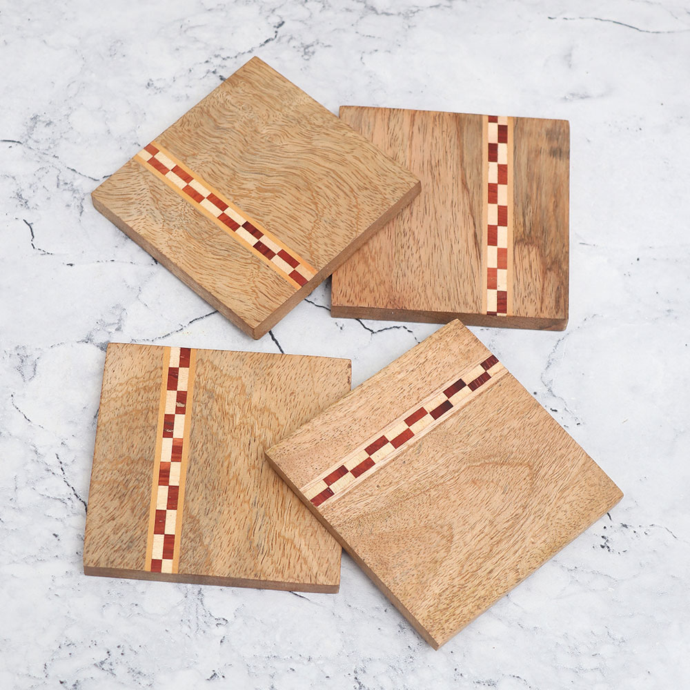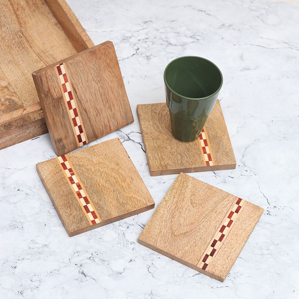 Buy a finest addition to your tableware collection that is a Wooden Tea Coaster Set. Crafted from high-quality wood, this Pack of four coasters boasts an elegant square shape that effortlessly blends functionality with aesthetics. Each coaster is meticulously handmade by talented Indian artisans, showcasing their craftsmanship and attention to detail. Finished in an antique brown hue, these coasters exude a timeless charm that adds a touch of sophistication to any setting. The intricate white and red engravings further enhance their visual appeal, transforming them into exquisite decorative pieces for your home or office. Designed to protect your surfaces from water rings and stains, these coasters serve as the perfect accompaniment for water, tea, juice, or coffee glasses. Versatile and durable, they find their place in various settings, including homes, offices, restaurants, hotels, and cafes. Not only are they a practical addition to your space, but they also make for a thoughtful gift for your loved fours on special or festive occasions.