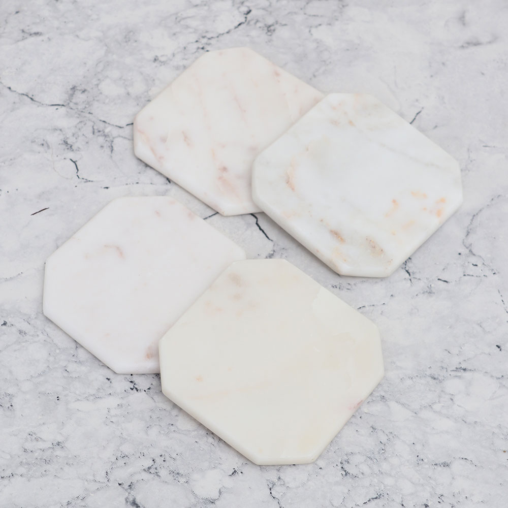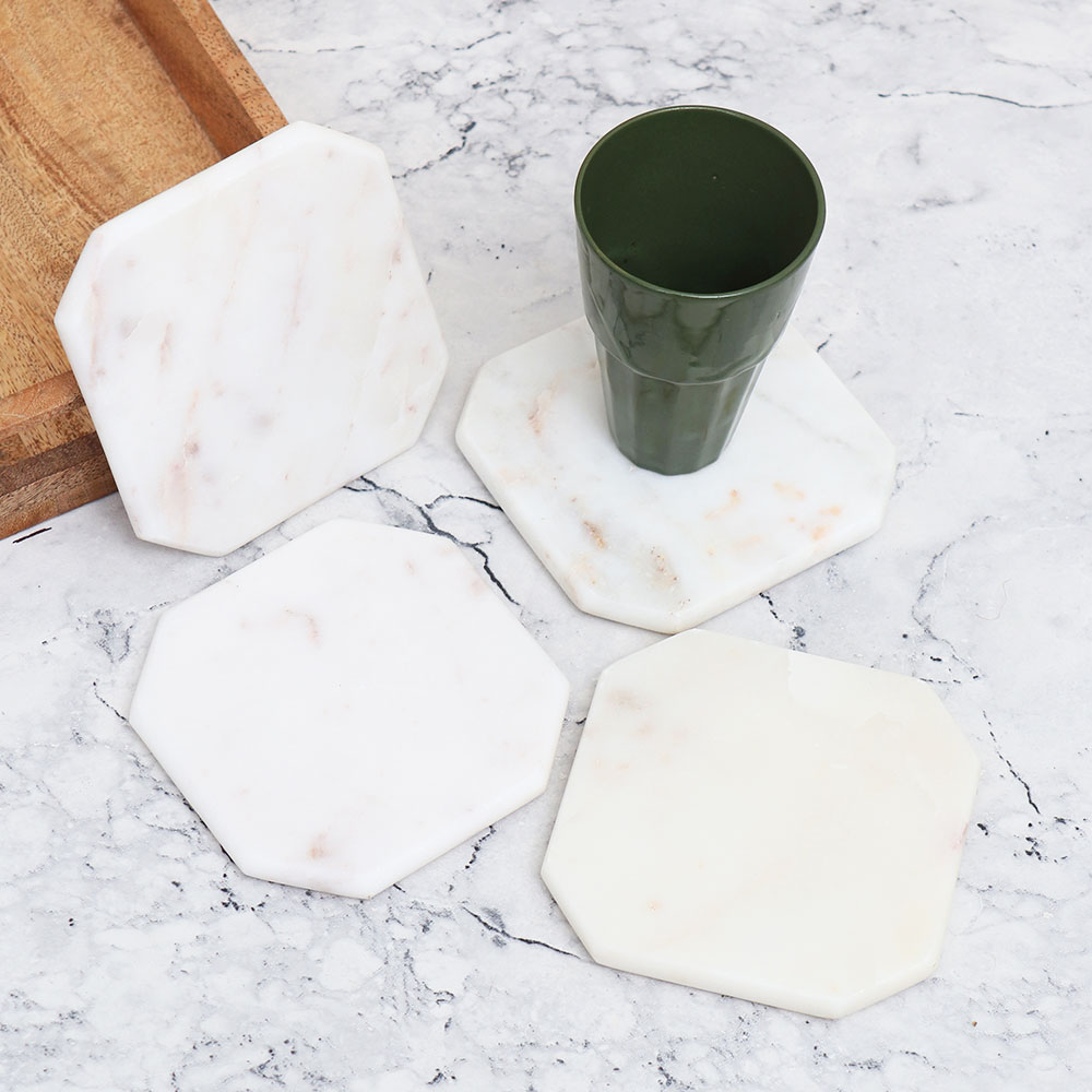 This Pack of 4 Marble Tea Coasters is crafted from premium-quality wood by highly skilled and experienced Indian artisans. Each coaster features a unique square shape with beautifully curved corners, adding an elegant touch to any setting. Handmade with precision and care, these coasters are a testament to the artisan’s craftsmanship. Finished in a pristine white colour, these coasters effortlessly blend style and functionality, making them a perfect decorative piece for your home or office. Their purpose goes beyond aesthetics, as they are designed to hold water, tea, juice, or coffee glasses, ensuring your surfaces remain free from stains and spills. These Marble coaster sets are versatile, ideal for use in various environments such as homes, offices, restaurants, hotels, or cafes. They not only protect your surfaces but also elevate the visual appeal of your space. Furthermore, they make for an exceptional gift option for your loved fours on special or festive occasions.