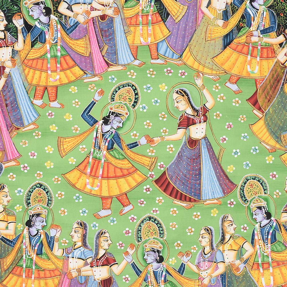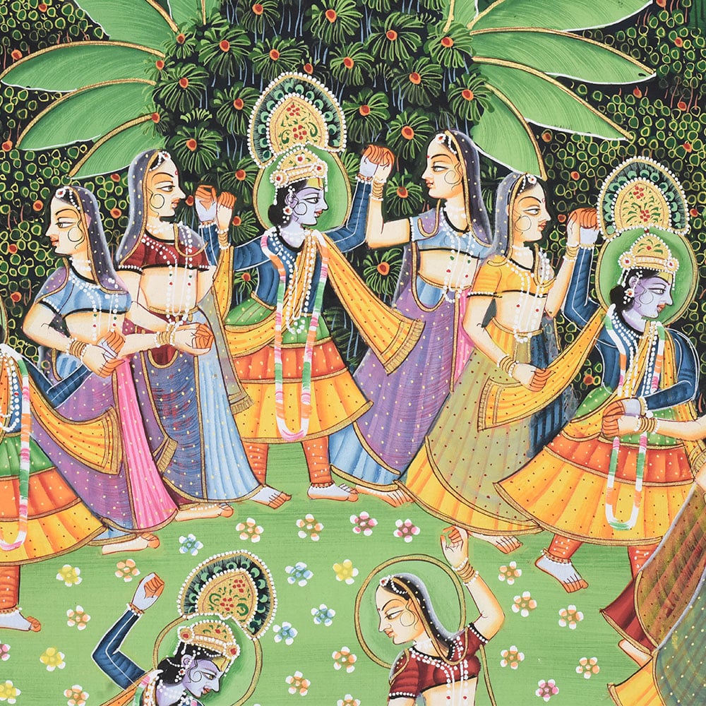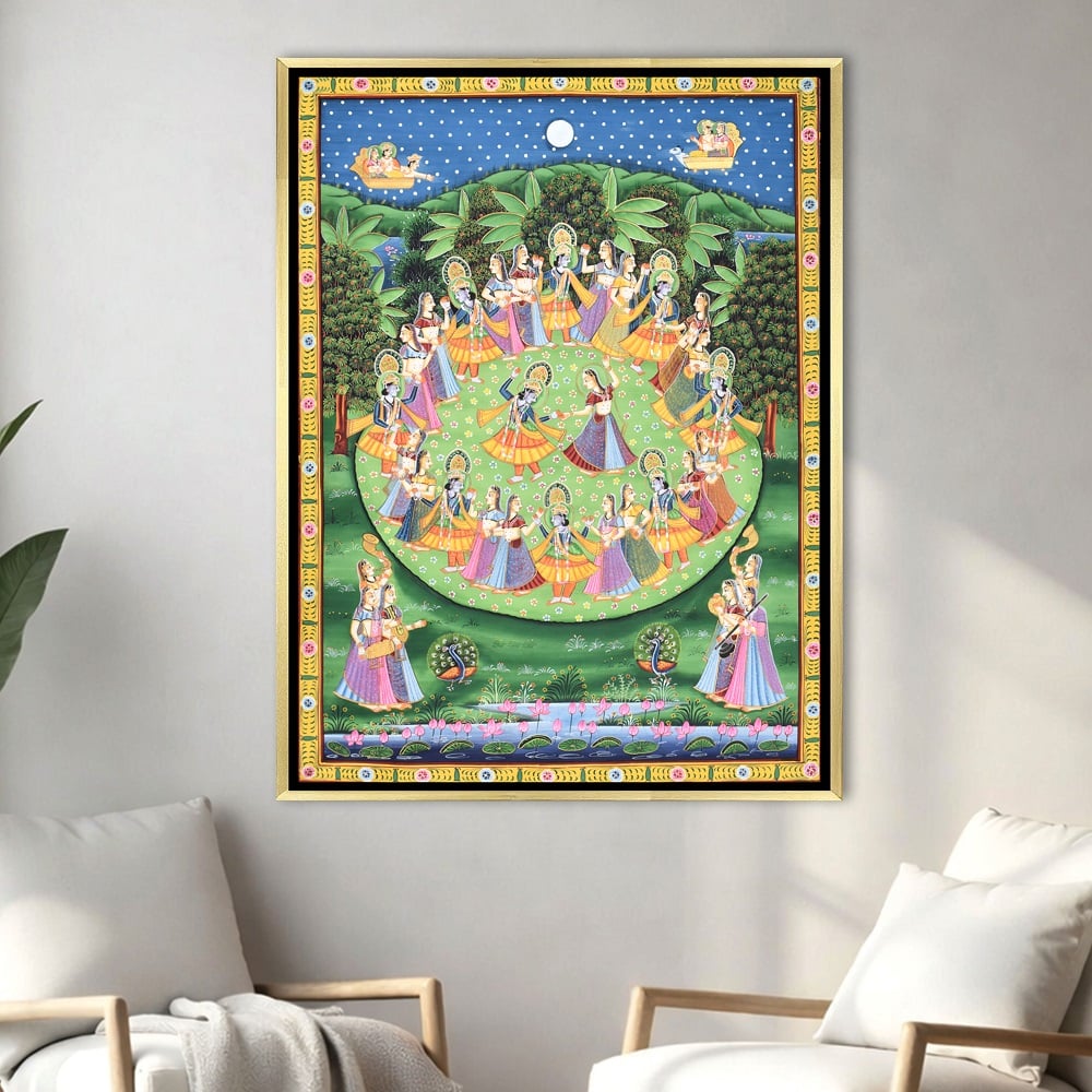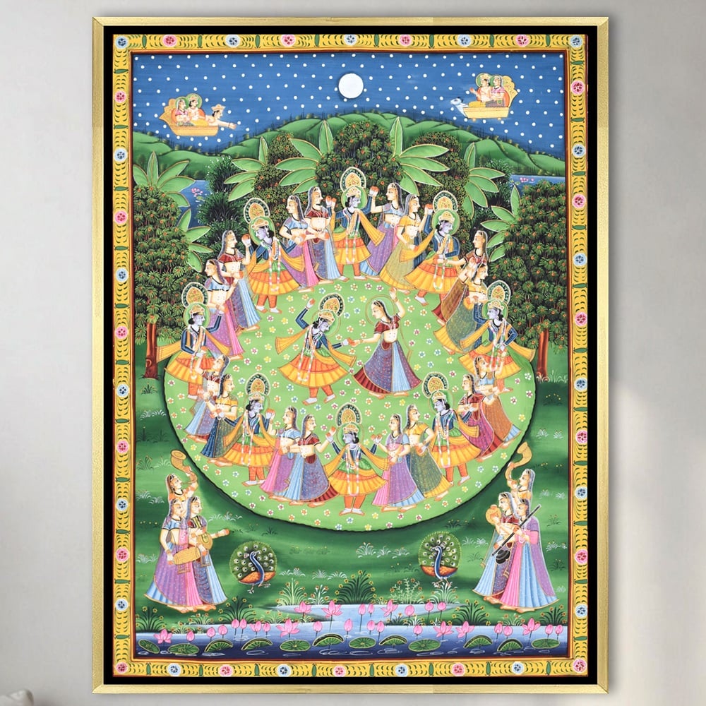 This finely Handmade Pichwai painting presents the sacred Raas Mandala, a devotional representation of Lord Krishnas divine dance with the gopis beneath a moonlit Vrindavan sky. Originating from the Nathdwara temple tradition of Rajasthan, Pichwai paintings are created as narrative backdrops that visually express the spiritual teachings and seasonal festivities associated with Shrinathji. In this composition, Krishna appears in multiple forms within a perfectly balanced circular arrangement, symbolizing his omnipresence and the eternal bond between the divine and the devotee. The surrounding gopis move in rhythmic harmony, creating a meditative visual flow that reflects the transcendental nature of the Raas Leela. Lush trees, flowering foliage, peacocks, and a lotus-lined water body enrich the pastoral setting, while celestial motifs in the night sky reinforce the sacred atmosphere of the scene. The ornamental border further frames the narrative with precision, maintaining the symmetry and intricacy that define traditional Pichwai artistry. Whether displayed in a spiritual interior or a curated exhibition space such as those hosted at Modern Art Gallery, this artwork offers both cultural significance and aesthetic depth making it a meaningful addition for collectors of Indian temple art.