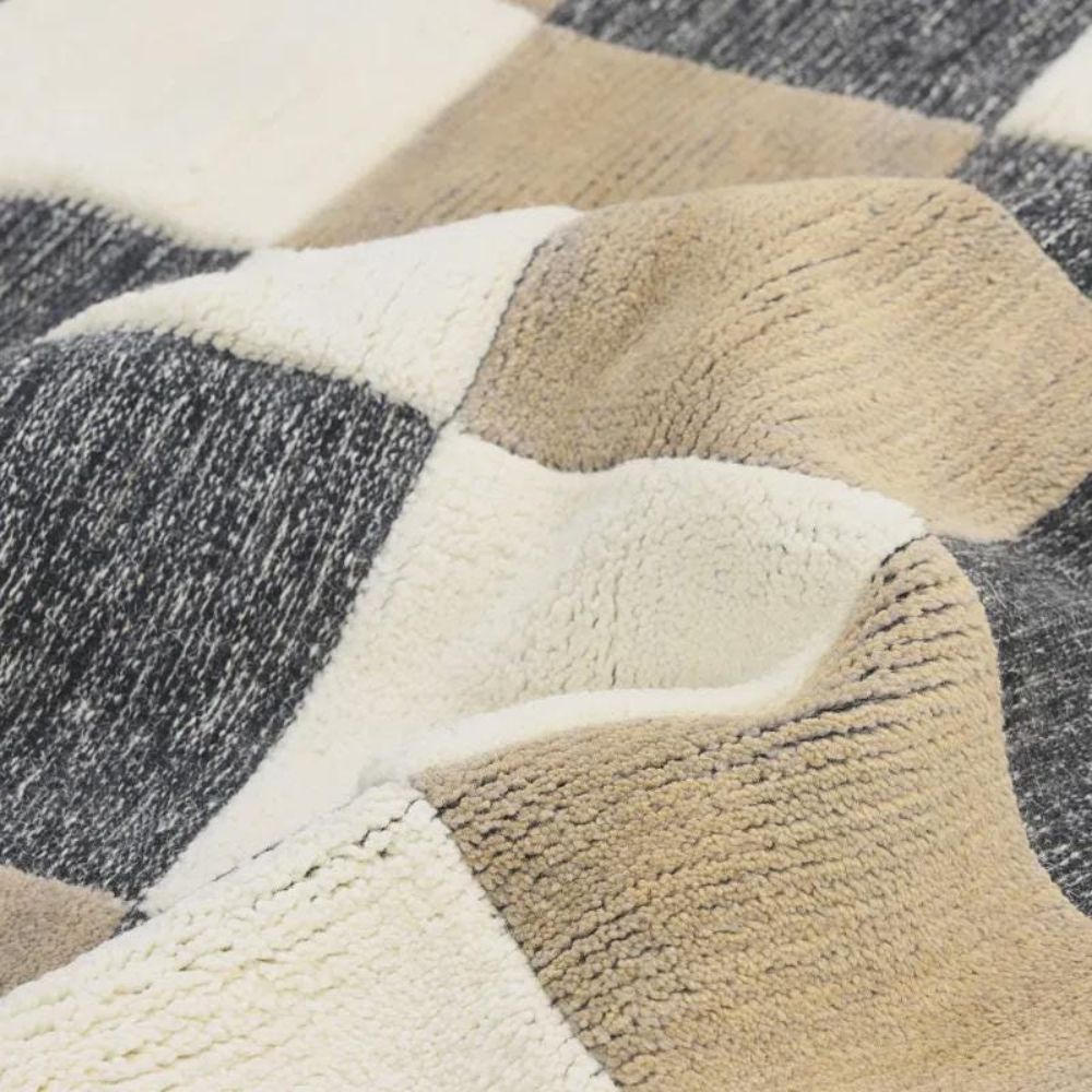 Bring modern charm into your interiors with the Moroccan Zebra Design Rug, crafted in a cotton-wool blend. Featuring a bold checkered pattern in neutral ivory, beige, and deep grey, this rug blends contemporary aesthetics with artisanal craftsmanship. Packed & quality-checked by Indianshelf.