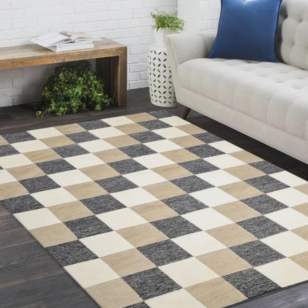Bring modern charm into your interiors with the Moroccan Zebra Design Rug, crafted in a cotton-wool blend. Featuring a bold checkered pattern in neutral ivory, beige, and deep grey, this rug blends contemporary aesthetics with artisanal craftsmanship. Packed & quality-checked by Indianshelf.