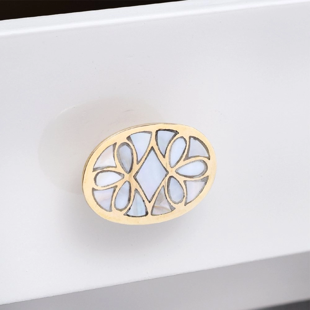Enhance the aesthetic of your furniture with our exquisite Mother of Pearl Round Knob in a pristine white and golden finish. This stunning knob is not just a functional piece but also a work of art, handcrafted by skilled Indian artisans who have honed their craft for generations. The intricate flower design adds a touch of elegance and charm to any drawer, dresser, cabinet, wardrobe, cupboard, or almirah. Our Mother of Pearl knob is the epitome of luxury and craftsmanship, making it the perfect choice for both residential and commercial spaces. It's not just handles for cabinets and drawers, it's a statement of your impeccable taste. Whether you're looking to upgrade your kitchen handles for cabinets or add a touch of opulence to your office, hotel, cafe, or shop, this knob is the ideal choice. Moreover, it's an ideal gift for your loved ones on special or festive occasions. Show them you care by gifting them a piece of Indian craftsmanship that exudes beauty and sophistication.