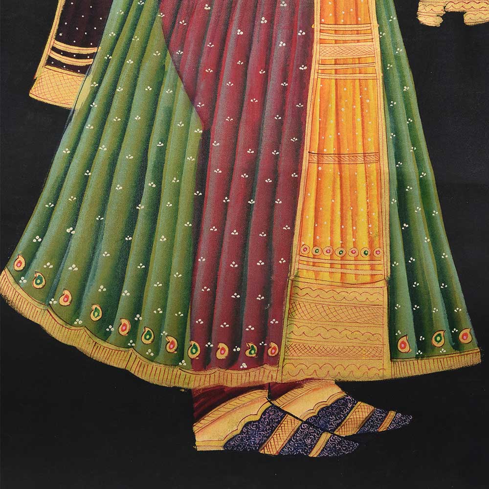 This Canvas Mughal painting f a single, standing female figure with a roe in her hand can be used to adorn the walls of your living room, hall, bedroom, shop, office or hotel.