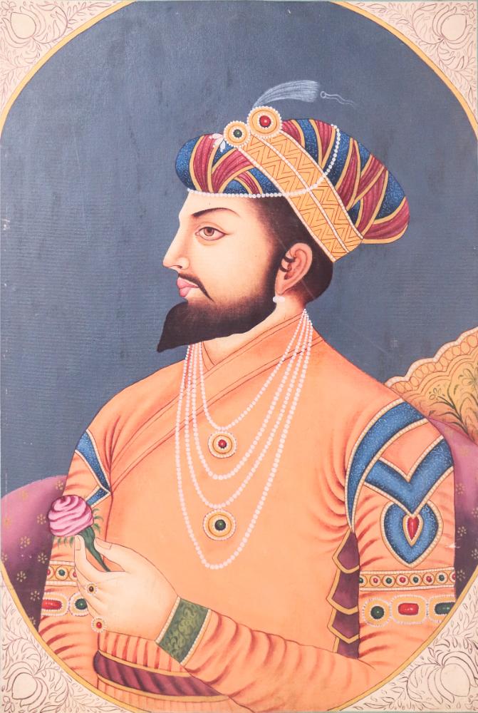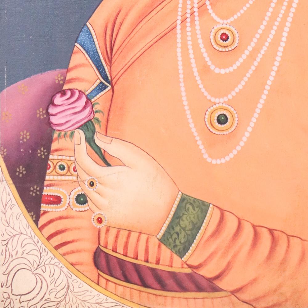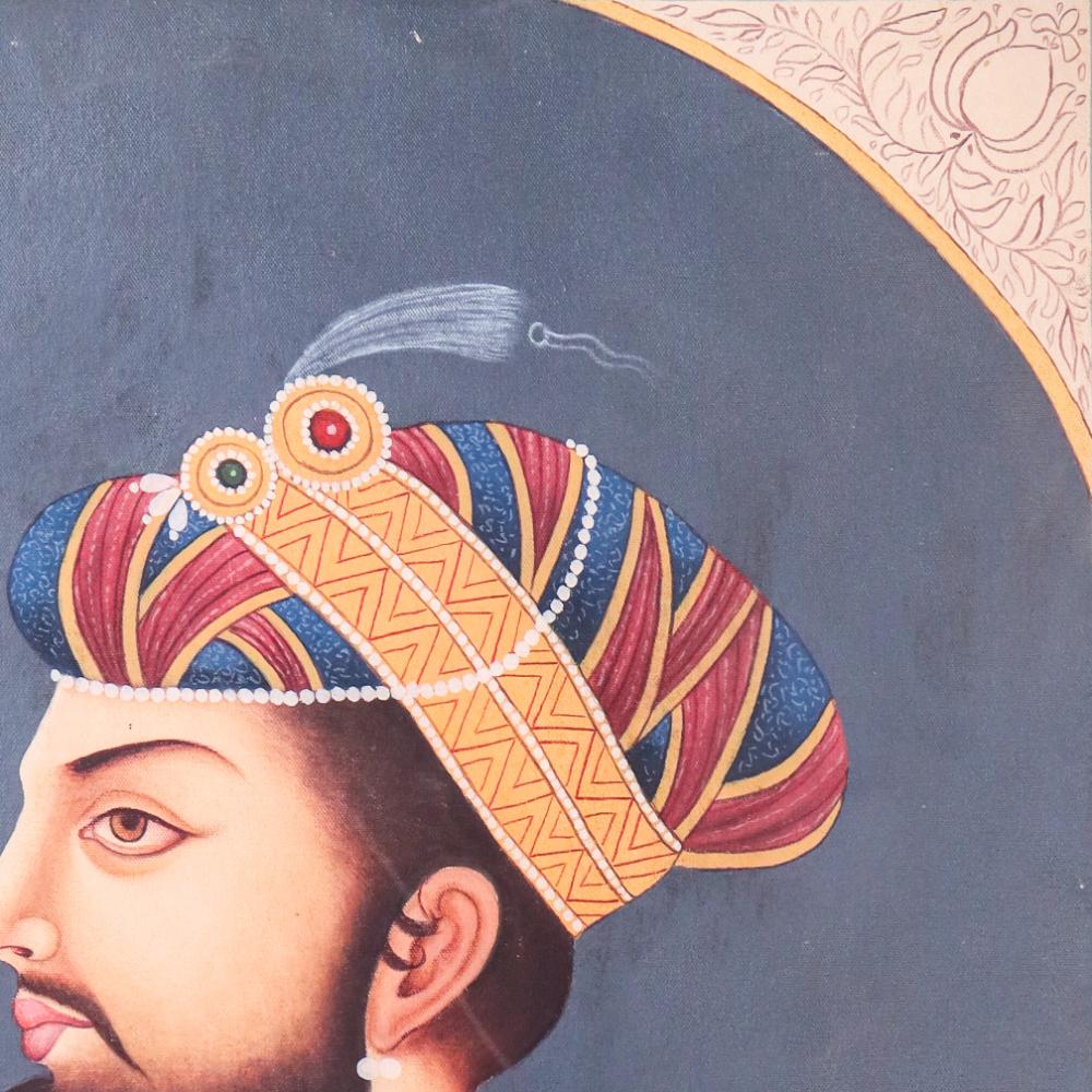 This magnificent acrylic canvas painting on board captures the essence of royal grandeur and timeless masculinity. Featuring a stately king in profile, the painting radiates nobility and grace. Dressed in a saffron-toned robe, adorned with multi-layered pearl necklaces and gemstones, the figure reflects the luxurious heritage of India’s imperial past. A majestic turban, highlighted with regal patterns and feathers, crowns the composition with elegance. The king gently holds a delicate pink rose, symbolizing beauty, reflection, and inner peace. The rich, matte blue background sets a powerful contrast, enhancing the richness of his attire and poise. Every element—from the hand detailing to the intricate jewelry—showcases the mastery of Indian miniature-style portraiture.