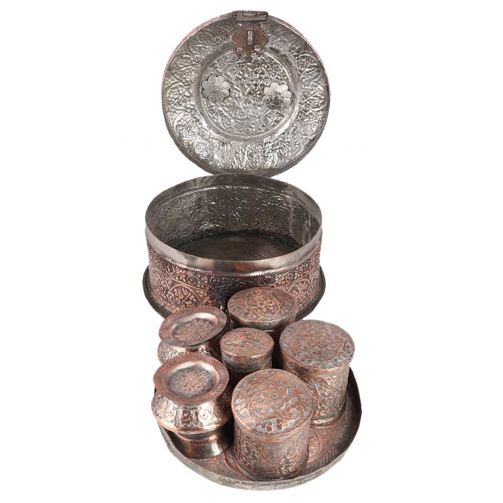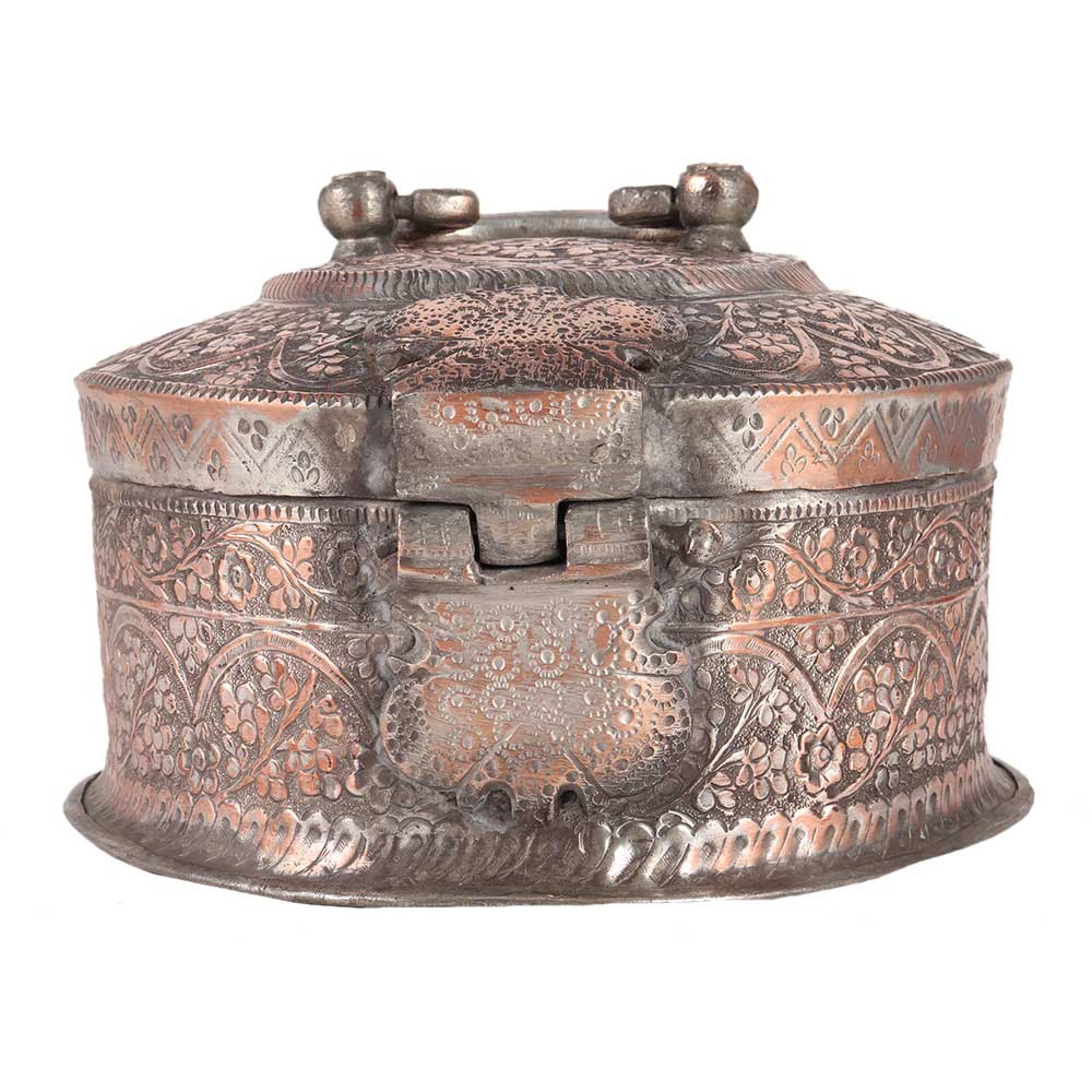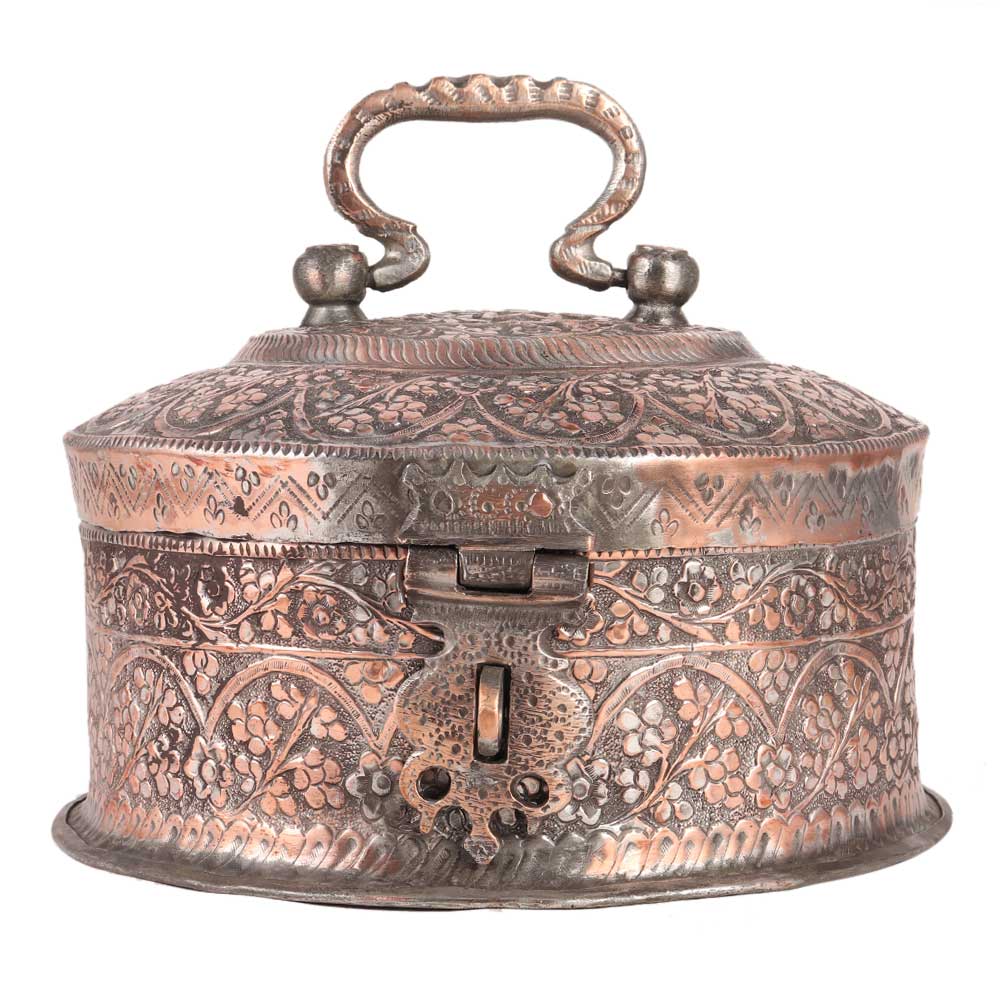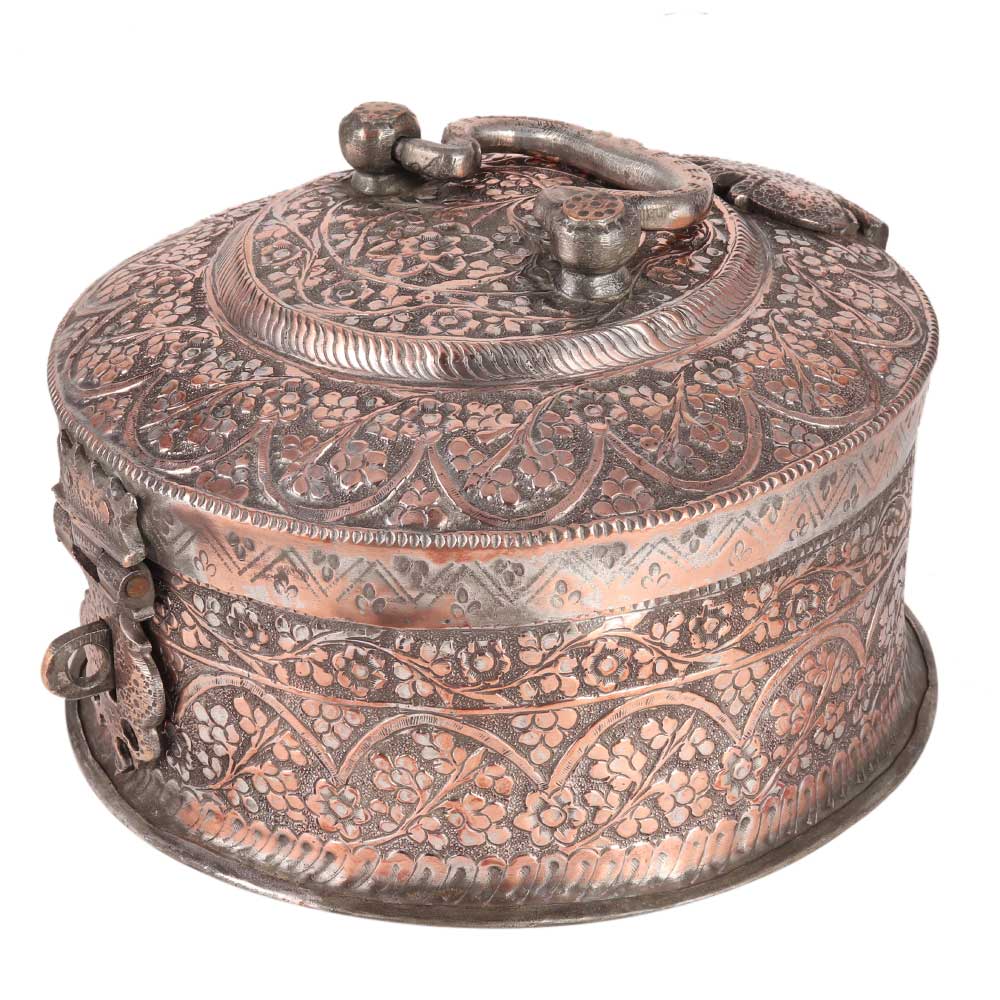 Handmade ornamental round tinned copper Mughal Indian box with lid, latch, and handle with floral and geometric designs that have been delicately and intricately hand-hammered. Handcrafted by skilled Northern Indian artisans. These Indian bread boxes  could also serve as a tea caddy or a treasure chest.