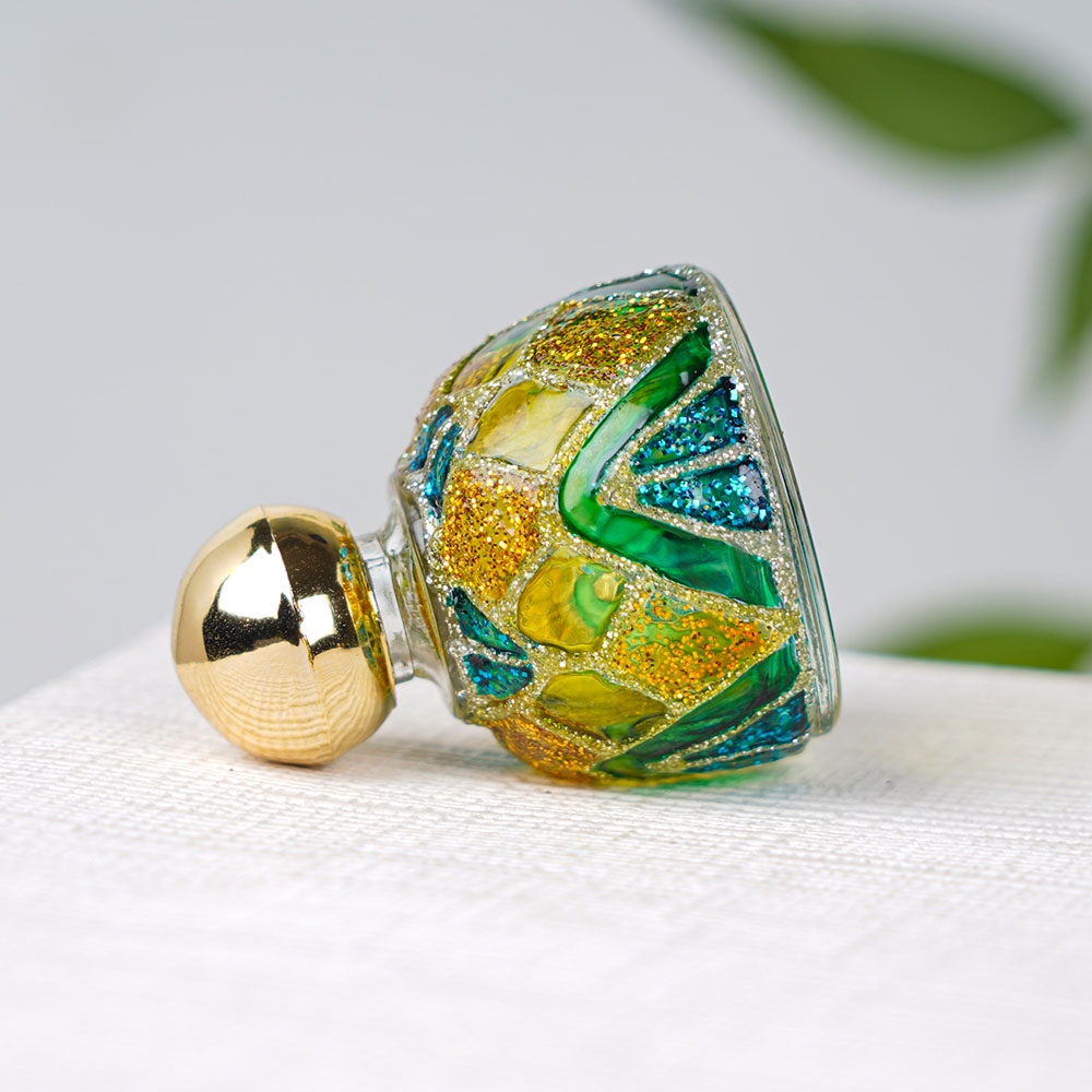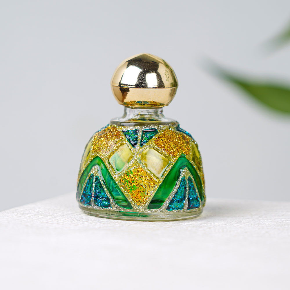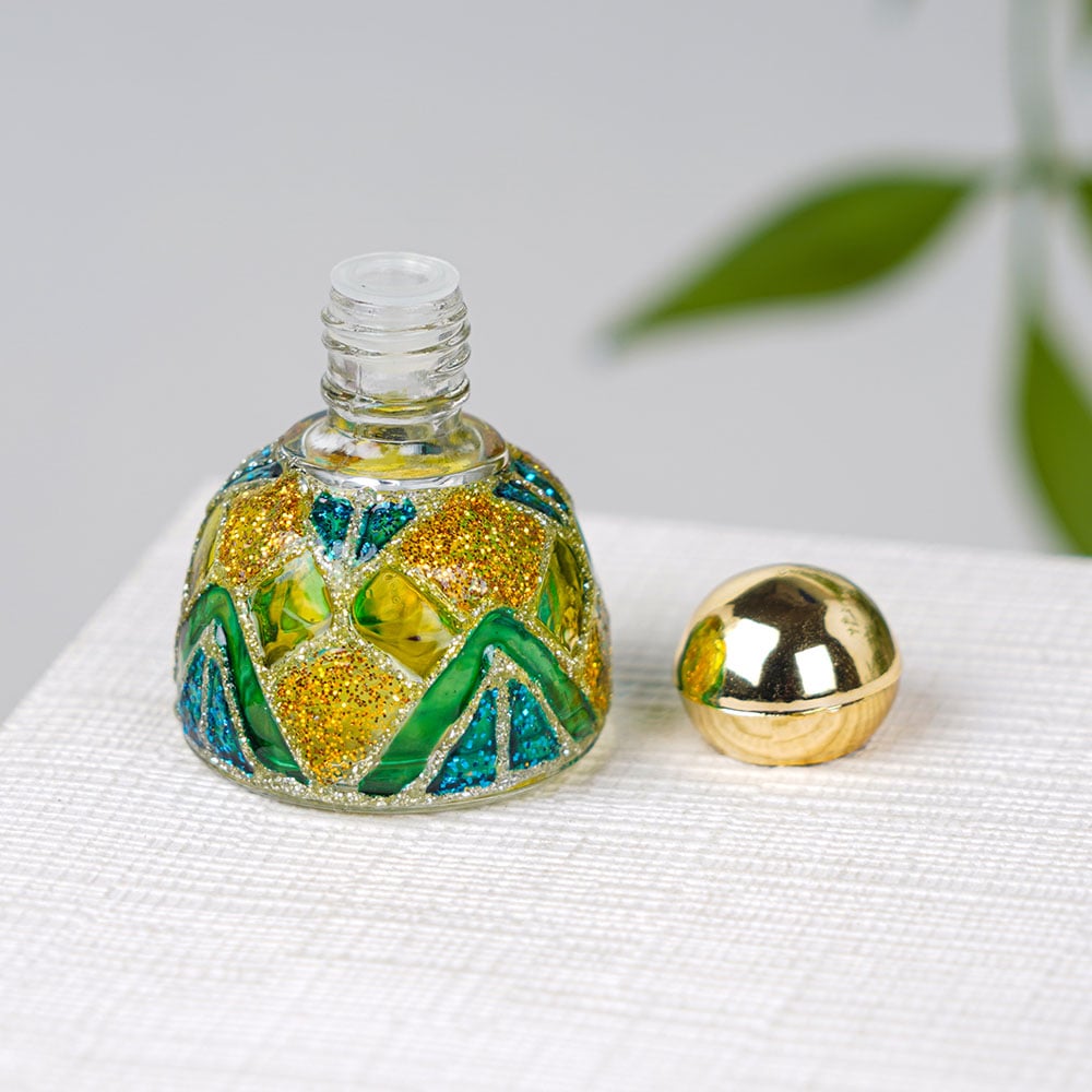 A glass bottle which is a work of art that combines beauty and functionality in one stunning piece. It is a handmade creation by highly skilled Indian craftsmen who have mastered the art of glass blowing and carving. The multi-coloured bottle features an intricate design of sparkles carved into its glass, in a blend of blue and golden hues that give it a stylish and fancy appearance. Adding to its elegance is a golden colour knob that is used to seal the bottle, ensuring that your perfume or oil remains fresh and fragrant. This perfume empty bottle is perfect for both display and practical use. You can place it on your dressing table, shelf or vanity to add a touch of glamour to your décor. Alternatively, you can use it to store your favourite perfume or oil, making it a functional and practical item as well. This bottle is a lovely gift for your family, friends or relatives, particularly for special or festive occasions. Its unique design and impeccable craftsmanship make it a treasured addition to any collection of stylish perfume bottles.