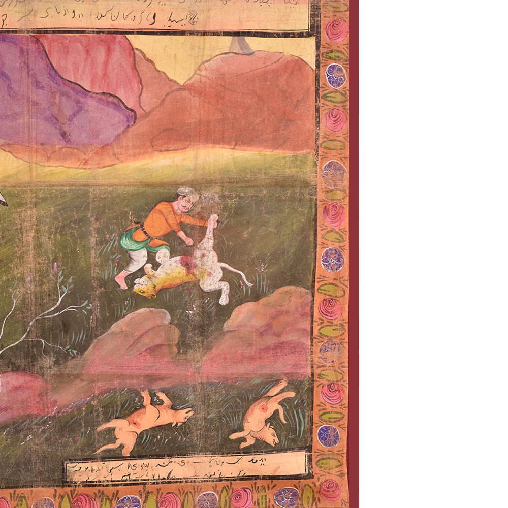 This exquisite Pichwai painting on fabric cloth is a stunning masterpiece of traditional Indian artistry. Depicting a serene landscape with small mountains in the background, the painting captures the essence of nature's beauty with intricate detailing of lush trees and foliage. At the centre of the painting, a hunter sits on a majestic horse, ready to strike with his arrow and bow. His prey lies on the ground, symbolizing the ancient art of hunting in Indian culture. The painting is adorned with vibrant multi-colours, giving it a lively and festive feel. The level of detail and precision in the painting is a testament to the skill and expertise of the professional Indian artists who have created it. The Pichwai painting is perfect for hanging in living room or bed room. It can also be gifted to your loved ones on special occasions, such as weddings, housewarming ceremonies, or other festivals. This painting is sure to bring joy and auspiciousness to any space it graces.