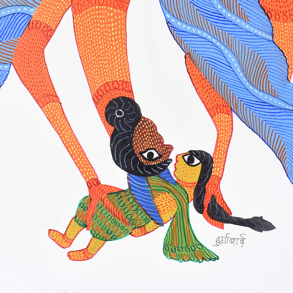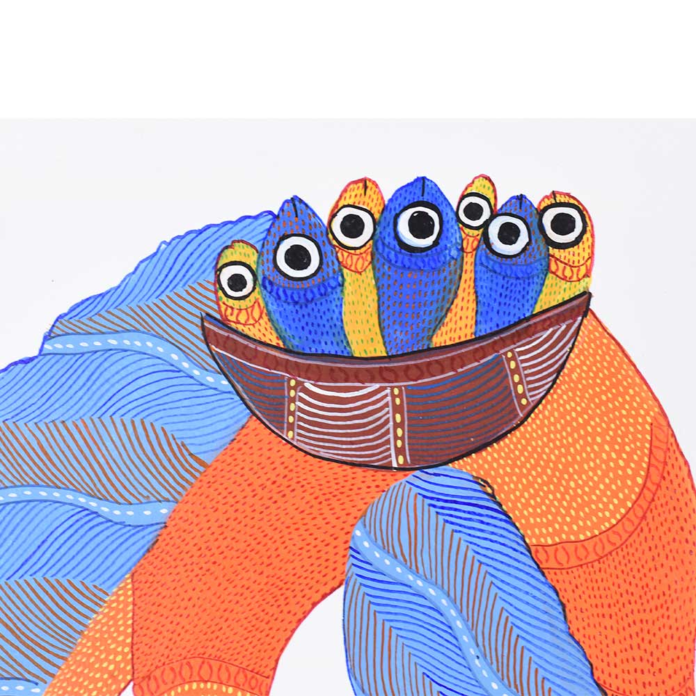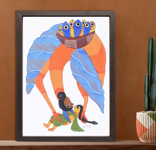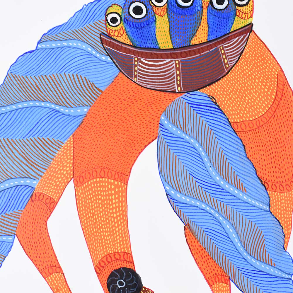 - Features intricate patterns and vibrant acrylic colors typical of Gond Art.