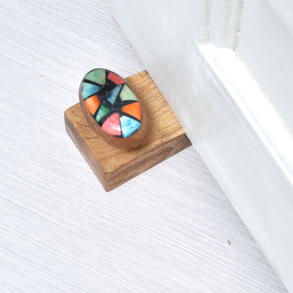 This beautiful door stopper is crafted from high-quality wood and adorned with an enchanting antique brown finish. Handmade by highly skilled Indian artisans, this door stopper is a true masterpiece of craftsmanship. Its unique design features a beautifully patterned wooden attachment on top, showcasing a delightful array of multi-colours. Not only does this door stopper add a touch of elegance to any space, but it also serves a practical purpose. The rubber grip discreetly placed underneath ensures a secure hold, preventing unwanted slipping and protecting your floors from damage. With its impeccable blend of beauty and functionality, our door stopper makes for an ideal gift for your loved ones, especially on special occasions like housewarmings.