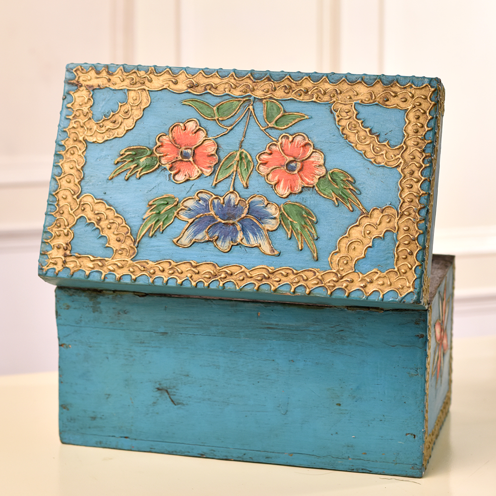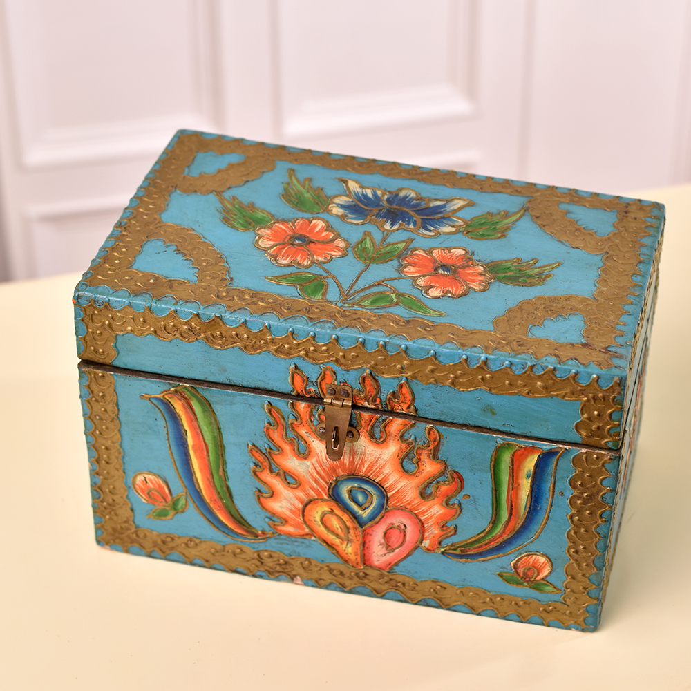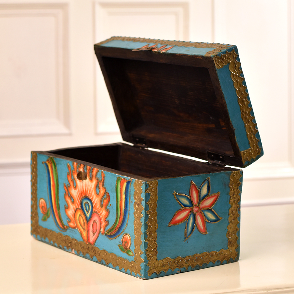 A rectangular wooden box which is a true masterpiece crafted by professional Indian artisans with unwavering dedication to their craft. This enchanting box is a work of art, designed to captivate your senses with its stunning beauty and meticulous attention to detail. Handmade from high-quality wood, this box boasts a rich and natural texture that exudes elegance and sophistication. The box's multi-colour finish, achieved through careful hand-painting, adds a delightful vibrancy, making it an eye-catching addition to any room. Its intricate engravings tell a story of tradition and culture, showcasing the artisan's mastery of their craft. Practicality meets aesthetics with a secure latch, ensuring your precious jewelry or small trinkets remain safely stored. Versatile in its functionality, it is not only a jewelry box but also an ideal storage solution for various small items. Its undeniable charm makes it an excellent choice for exhibitions or a remarkable gift to celebrate special or festive occasions.