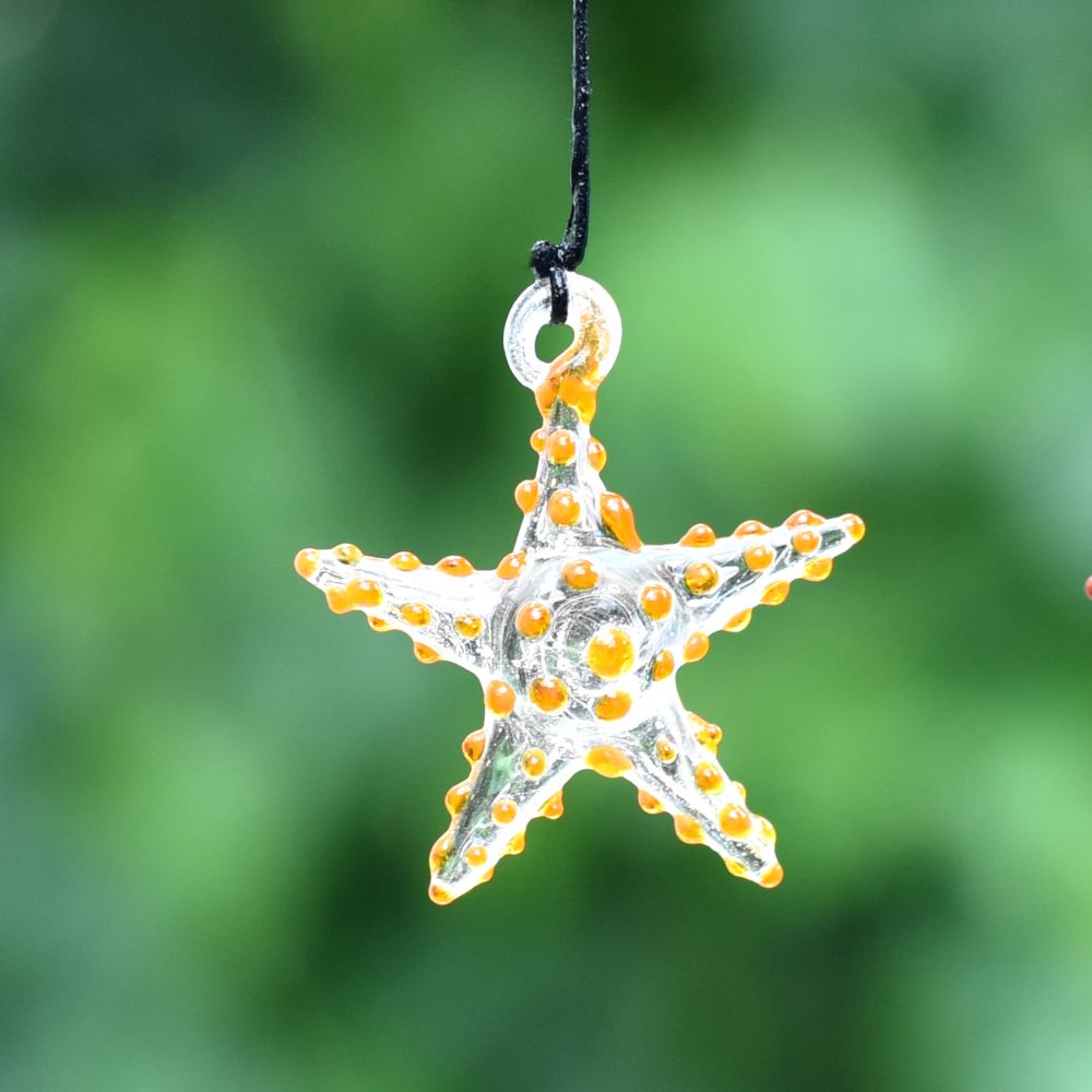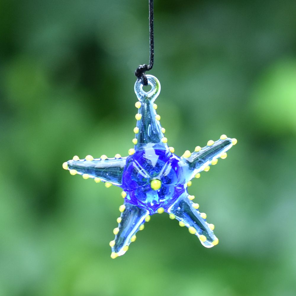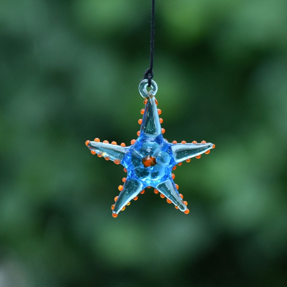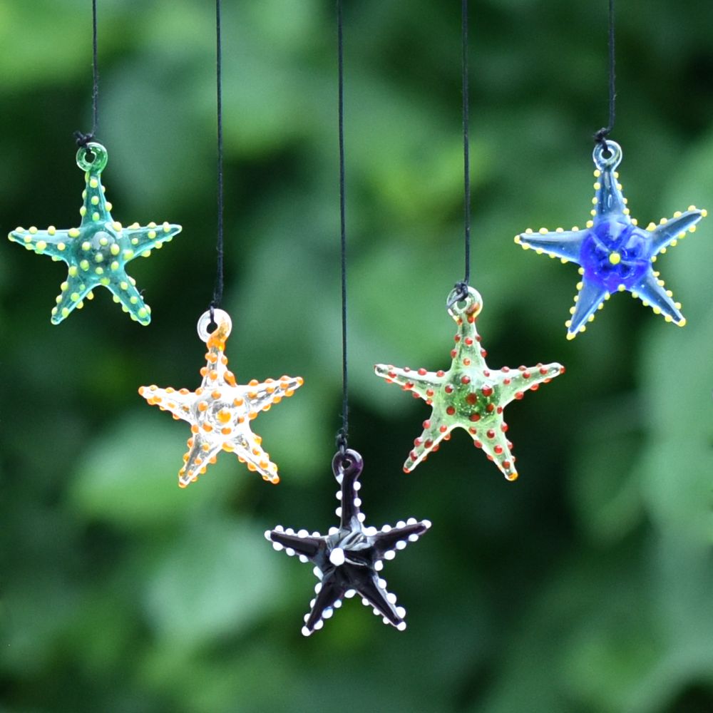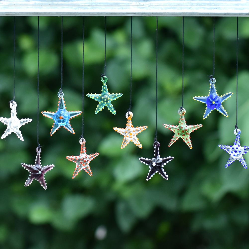 Add a touch of vibrant elegance to your Christmas tree with this captivating set of 10 multi-coloured starfish ornaments. These exquisite ornaments are meticulously crafted by highly skilled Indian artisans using the finest quality glass. Each ornament is handmade with utmost precision and attention to detail, ensuring a stunning result. The colourful assortment of starfish ornaments creates a mesmerizing display when hung on your Christmas tree. Their vivid hues and intricate designs make them a captivating focal point that will undoubtedly catch the eye of your guests. The ornaments delicate craftsmanship and unique charm add a delightful touch to your holiday decorations. Not only are these starfish ornaments perfect for adorning your own Christmas tree, but they also make exceptional gifts for your loved ones. Whether it's for a special occasion or a festive celebration like Christmas, presenting this set of ornaments to family, friends, or relatives is a thoughtful gesture that will be cherished for years to come. Bring joy, beauty, and a hint of Indian artistry to your holiday festivities with these high-quality, handmade starfish ornaments.