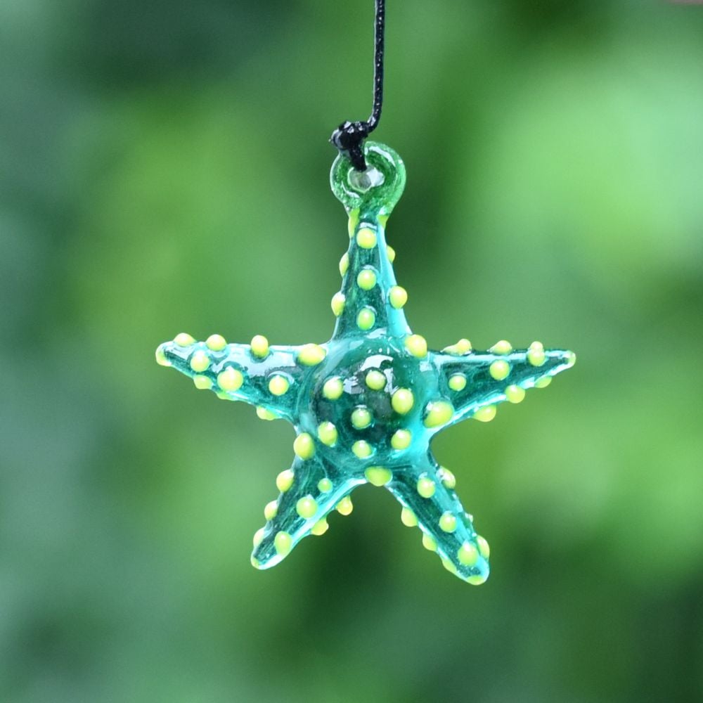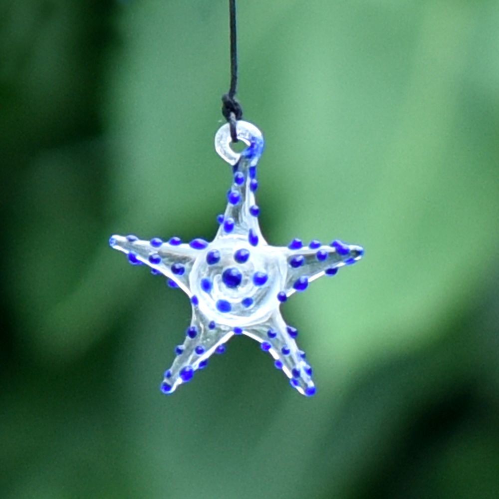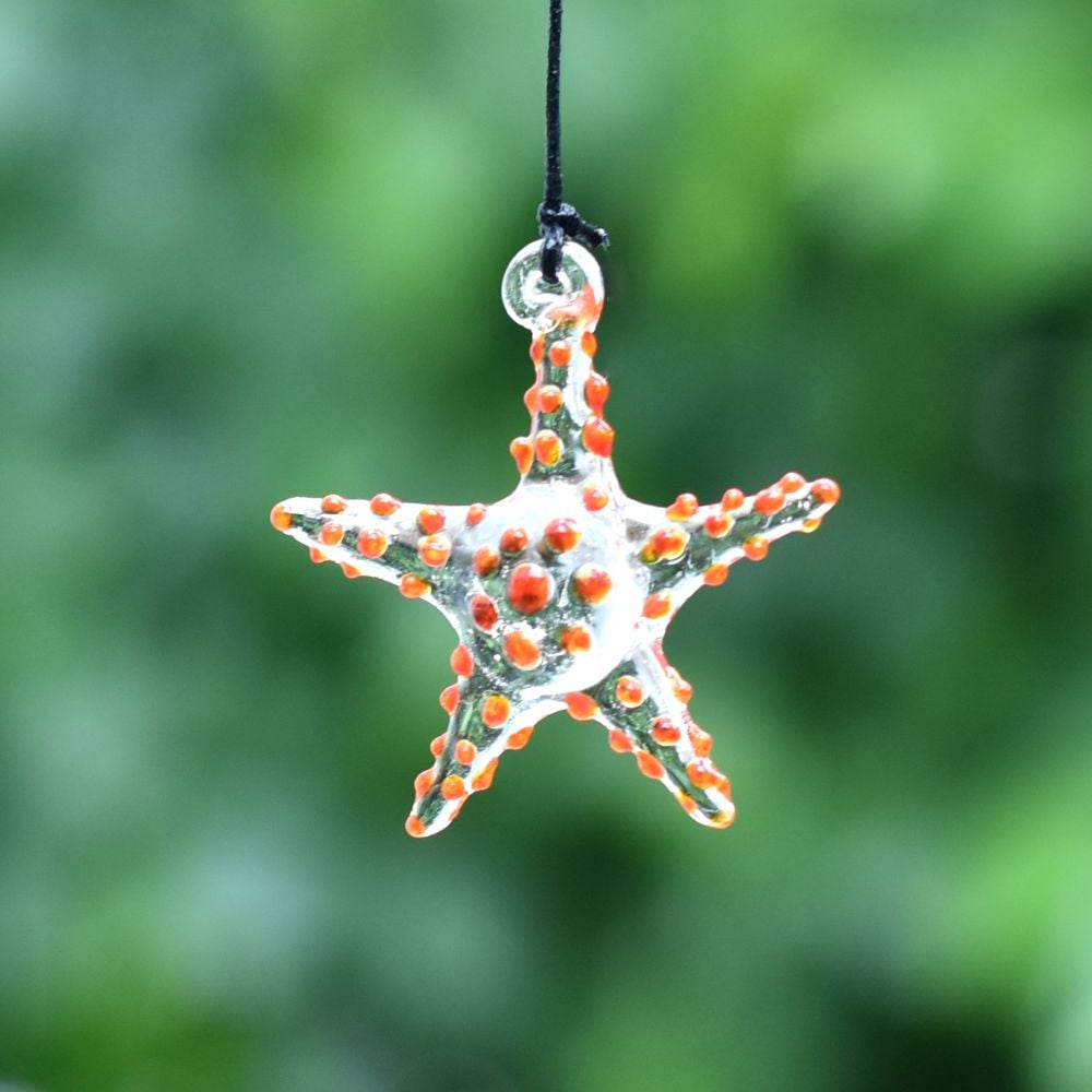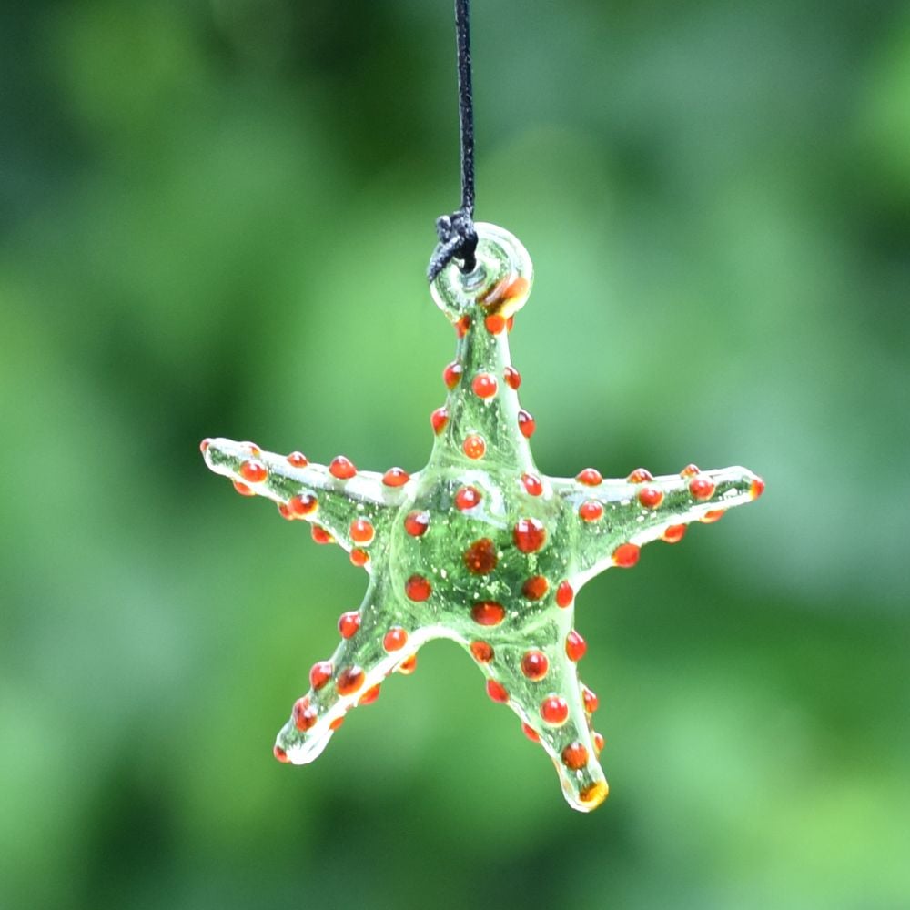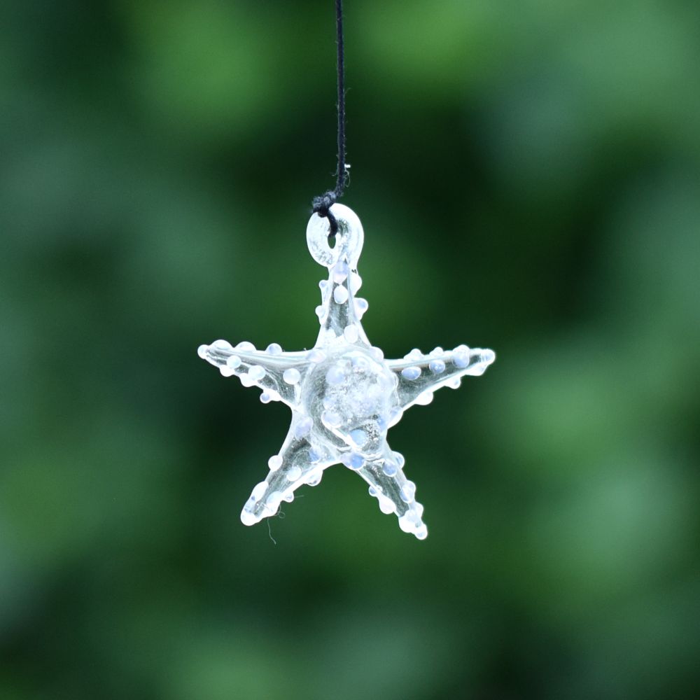 Add a touch of vibrant elegance to your Christmas tree with this captivating set of 10 multi-coloured starfish ornaments. These exquisite ornaments are meticulously crafted by highly skilled Indian artisans using the finest quality glass. Each ornament is handmade with utmost precision and attention to detail, ensuring a stunning result. The colourful assortment of starfish ornaments creates a mesmerizing display when hung on your Christmas tree. Their vivid hues and intricate designs make them a captivating focal point that will undoubtedly catch the eye of your guests. The ornaments delicate craftsmanship and unique charm add a delightful touch to your holiday decorations. Not only are these starfish ornaments perfect for adorning your own Christmas tree, but they also make exceptional gifts for your loved ones. Whether it's for a special occasion or a festive celebration like Christmas, presenting this set of ornaments to family, friends, or relatives is a thoughtful gesture that will be cherished for years to come. Bring joy, beauty, and a hint of Indian artistry to your holiday festivities with these high-quality, handmade starfish ornaments.