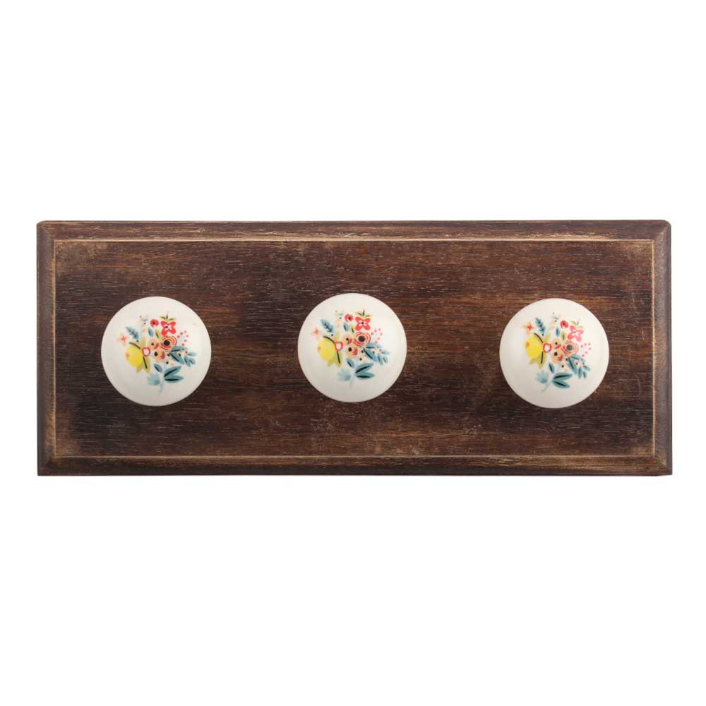 Multicolor Cream Base Ceramic Wooden Hook. A Perfect Complement to the Soft Tone of the Wood are these White Traditional Hat Coat Hook Made of Genuine Porcelain and Brass. It can be use to Hang Jewellery, Leashes, Towels, Scarves, Light Weight Sweaters, Caps Etc.