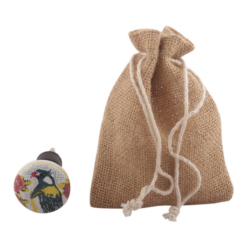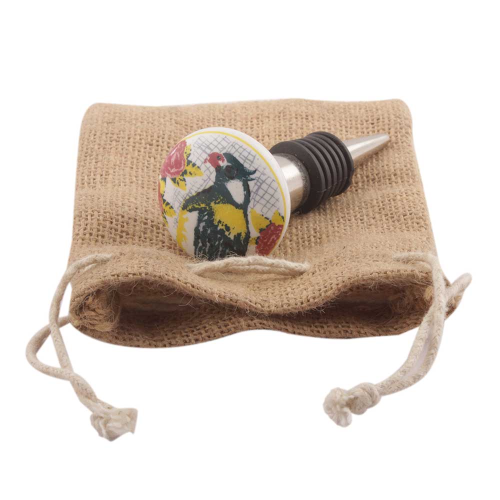 Multicolor Parrot Flat Ceramic Wine Stopper. Zinc Alloy Wine Bottle Stopper with Attractive Jute Bag Packaging.