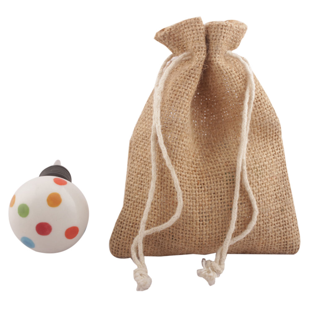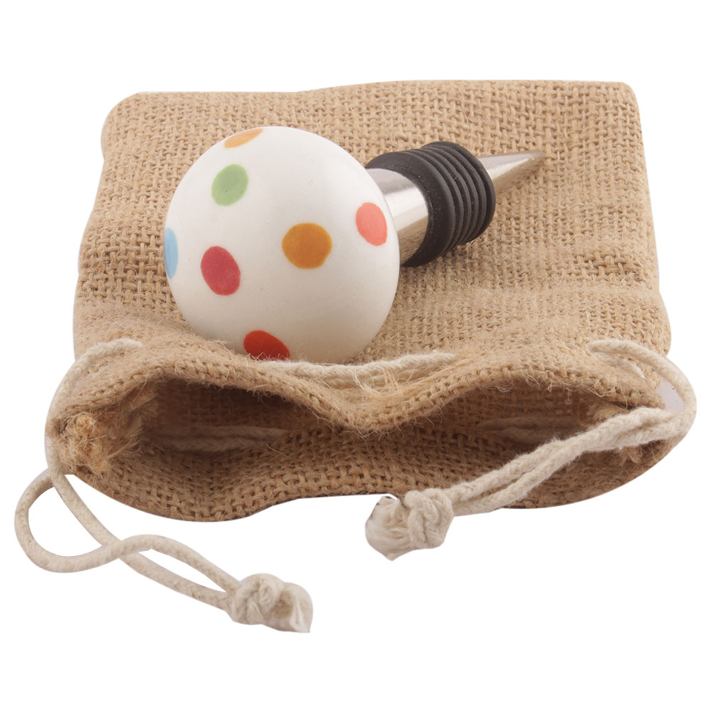 Multicolor Polka Dotted Ceramic Wine Stopper. Zinc Alloy Wine Bottle Stopper with Attractive Jute Bag Packaging.