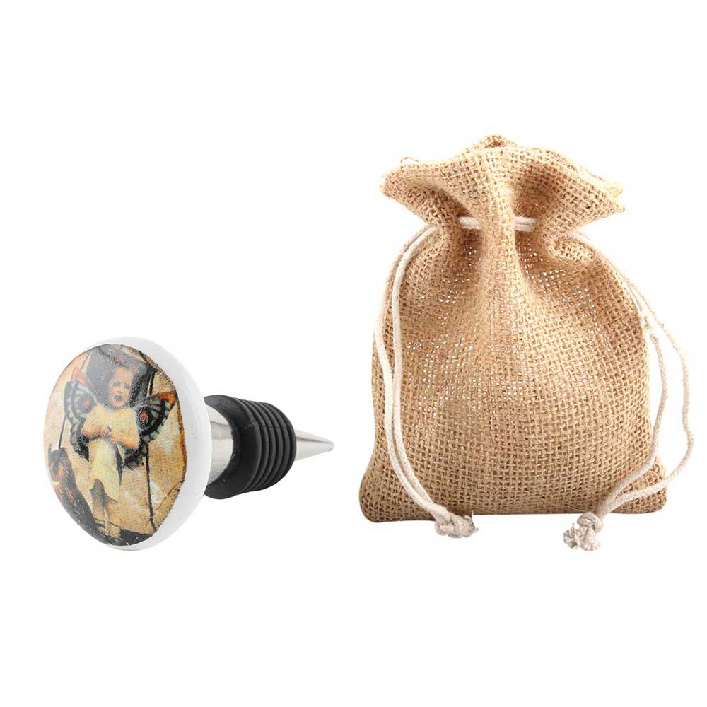 Multicolored Angel Baby Ceramic Flat Wine Bottle Stopper. Zinc Alloy Wine Bottle Stopper with Attractive Jute Bag Packaging.