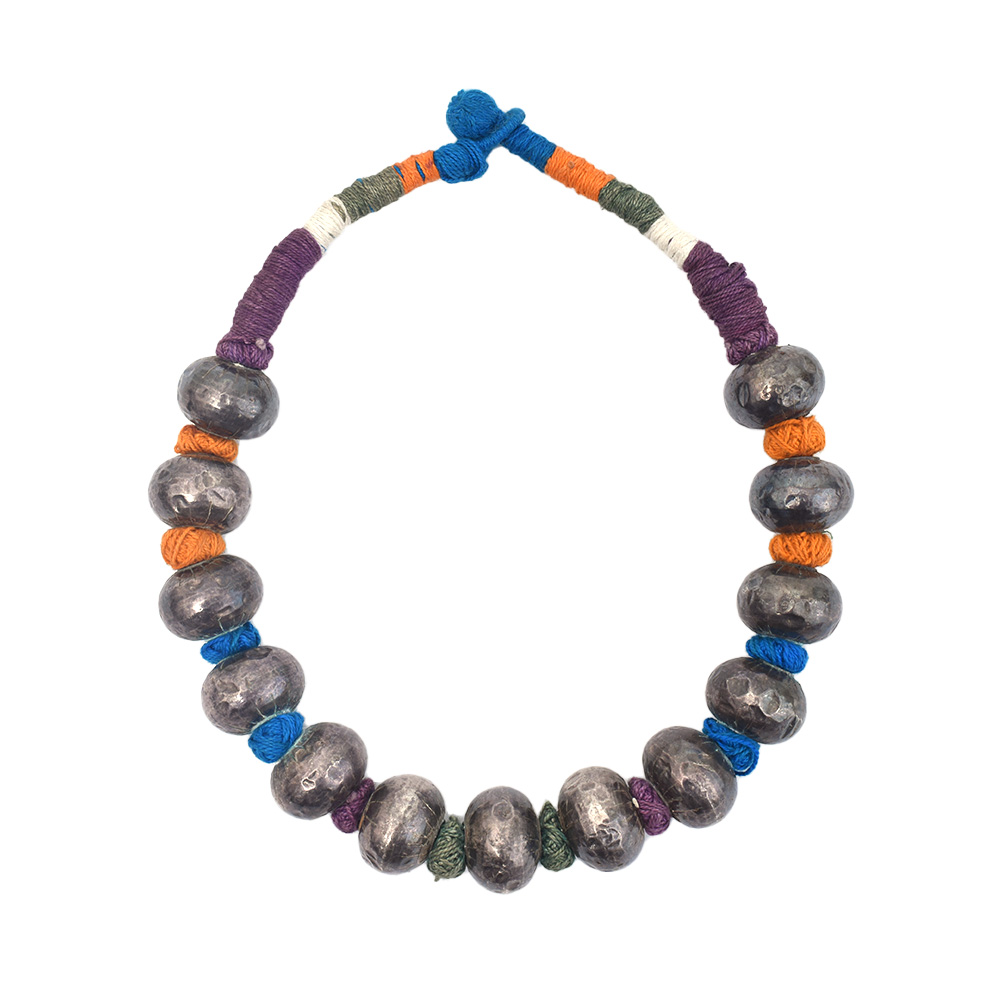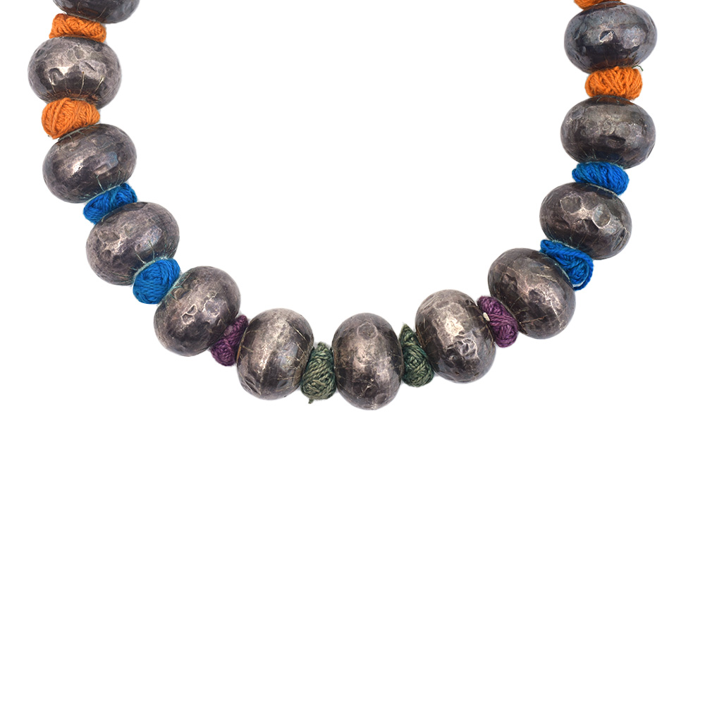 A multicolored beaded thread necklace is a vibrant and eye-catching piece of jewelry that features a variety of different colored beads strung together on a thread or cord. The necklace is typically made of small, round beads that are arranged in an intricate pattern, creating a unique and striking design. This necklace is perfect for adding a pop of color to any outfit and can be worn on any occasions, whether it's a casual or formal event. The necklace can be paired with other beaded jewelry or with more minimalistic pieces to create a dynamic and eclectic look. This necklace can also be a great gift for someone who loves colorful and unique jewelry. Overall, a multicolored beaded thread necklace is a fun and versatile way to add a touch of playfulness and creativity to any outfit.
