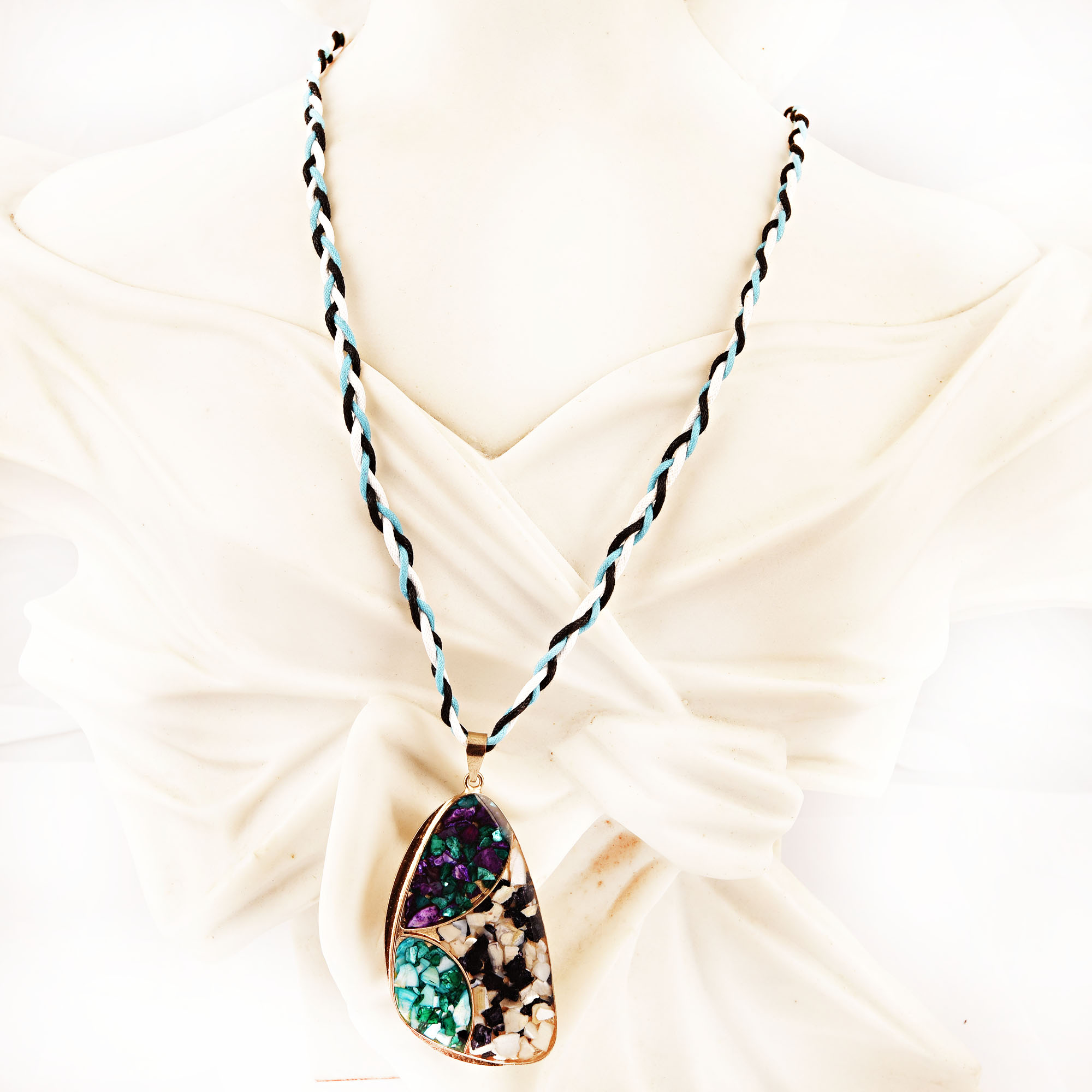 Multicolored Pendant Necklace New Beautiful Jewellery. Leather, Glass, Silk with Brass Chain and Brass Clasp.