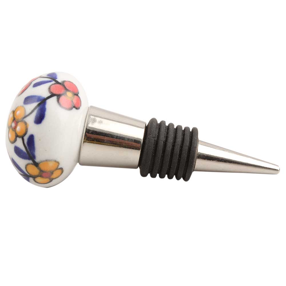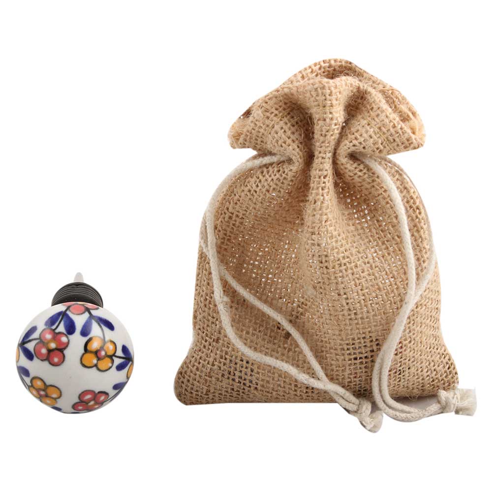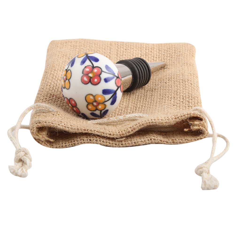 Mustard And Red Tiny Flower Ceramic Wine Stopper. Zinc Alloy Wine Bottle Stopper with Attractive Jute Bag Packaging.