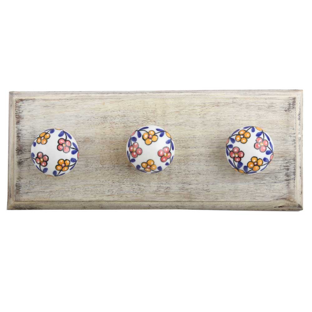 Mustard And Red Tiny Flower Ceramic Wooden Hook. A Perfect Complement to the Soft Tone of the Wood are these White Traditional Hat and Coat Hook Made of Genuine Porcelain and Brass. It can be used to Hang Jewelry, Leashes, Towels, Scarves, Light Weight Sweaters, Caps etc.