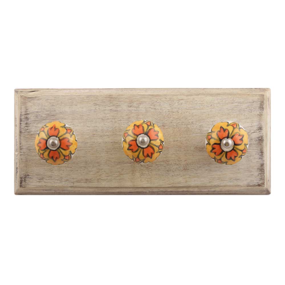 Mustard Ceramic Flower Wooden Hooks. A Perfect Complement to the Soft Tone of the Wood are these White Traditional Hat and Coat Hook Made of Genuine Porcelain and Brass. It can be used to Hang Jewelry, Leashes, Towels, Scarves, Light Weight Sweaters, Caps etc.