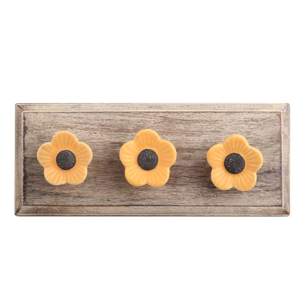 Mustard Daffodils Ceramic Wooden Hook. A Perfect Complement to the Soft Tone of the Wood are these White Traditional Hat and Coat Hook Made of Genuine Porcelain and Brass. It can be used to Hang Jewelry, Leashes, Towels, Scarves, Light Weight Sweaters, Caps etc.