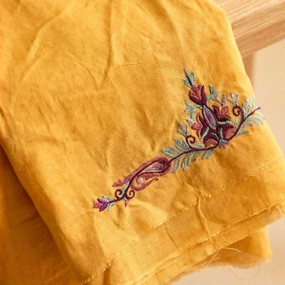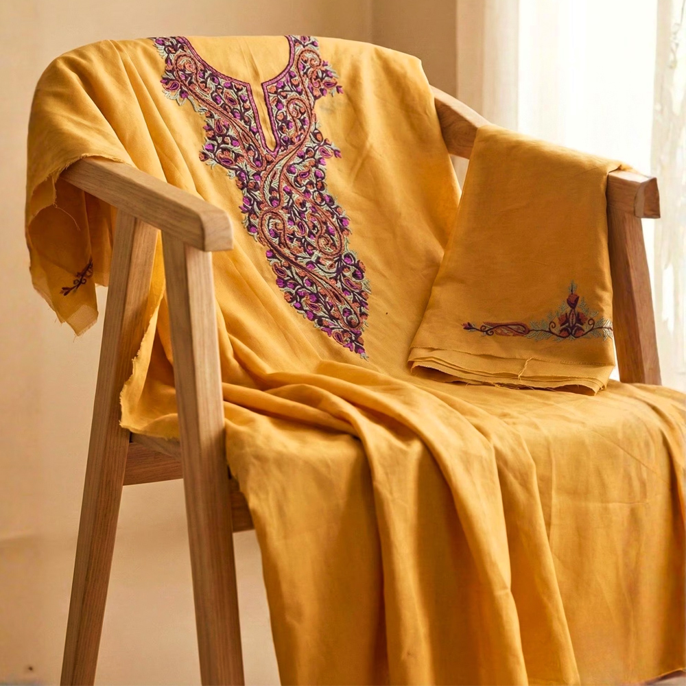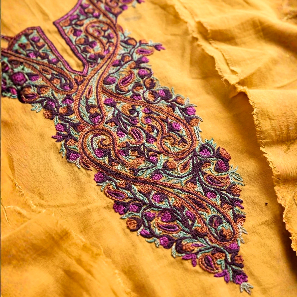 Rooted in Kashmiri textile heritage, this hand-embroidered cottonviscose kurta brings together rich colour, traditional paisley forms, and a soft, fluid silhouette. The warm mustard base is elevated with a densely handworked yoke featuring flowing paisley vines in layered tones of plum, teal, and earthy brown. Lightweight yet visually striking, this kurta is designed for those who value craftsmanship over trends.