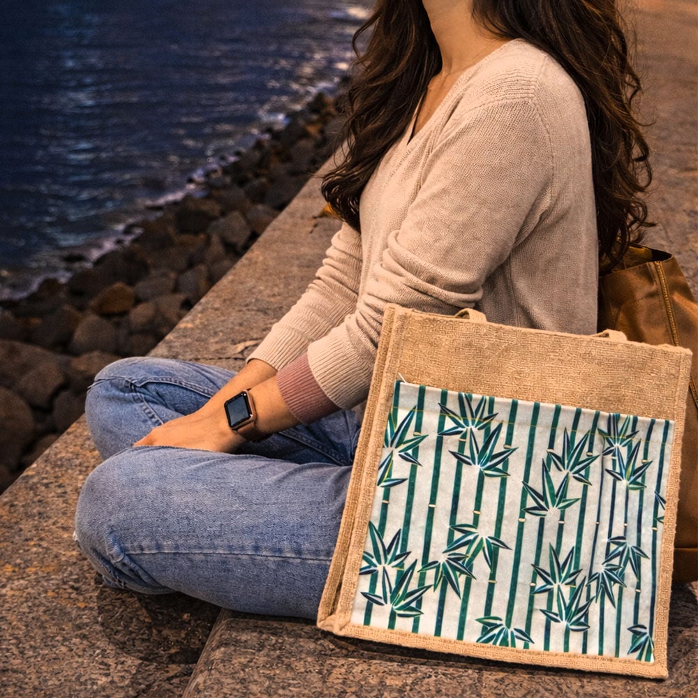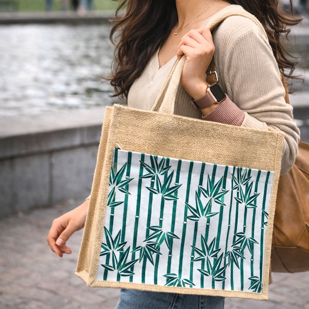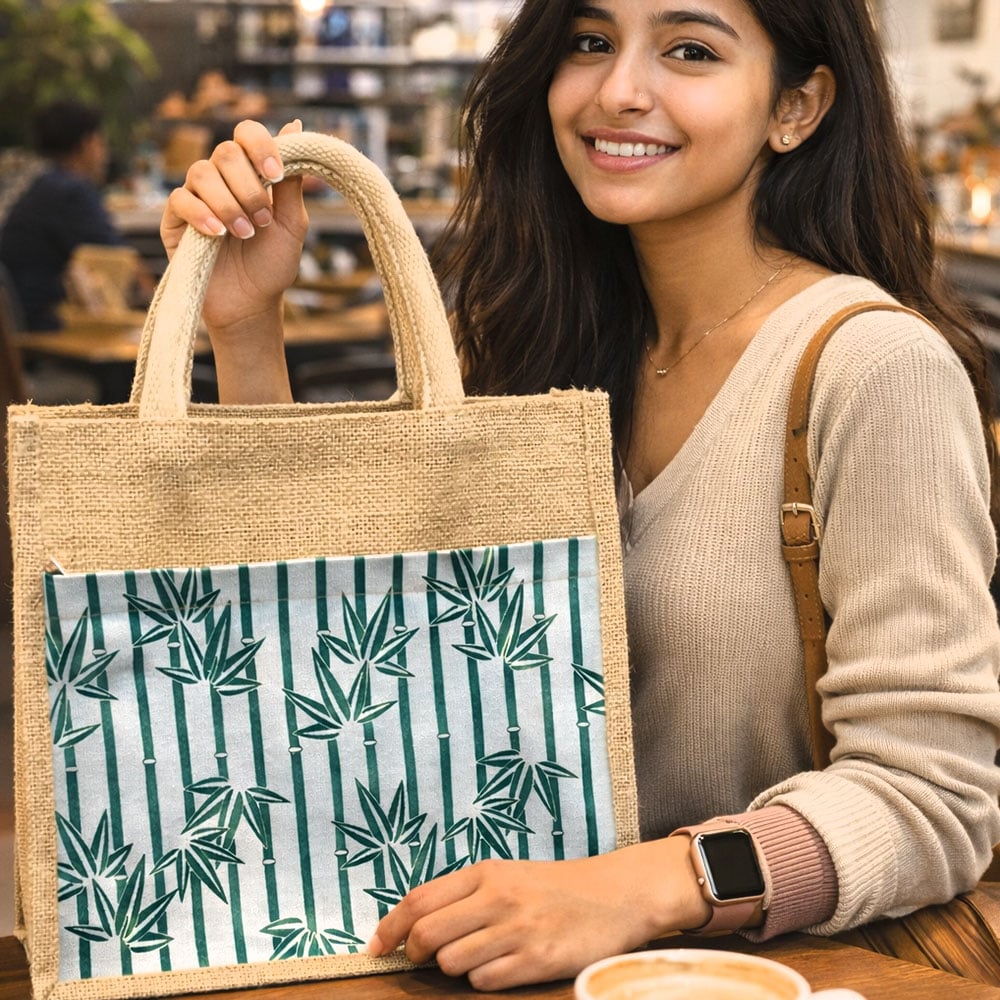 Experience eco-friendly style with this natural jute and cotton laminated bag finished with single colour green printing. Its spacious design suits daily errands and gifts while the laminated lining ensures durability and strength. Handcrafted from sustainable materials it reflects conscious living and is perfect for boutiques events and personal use. Packed and quality checked by Indianshelf.