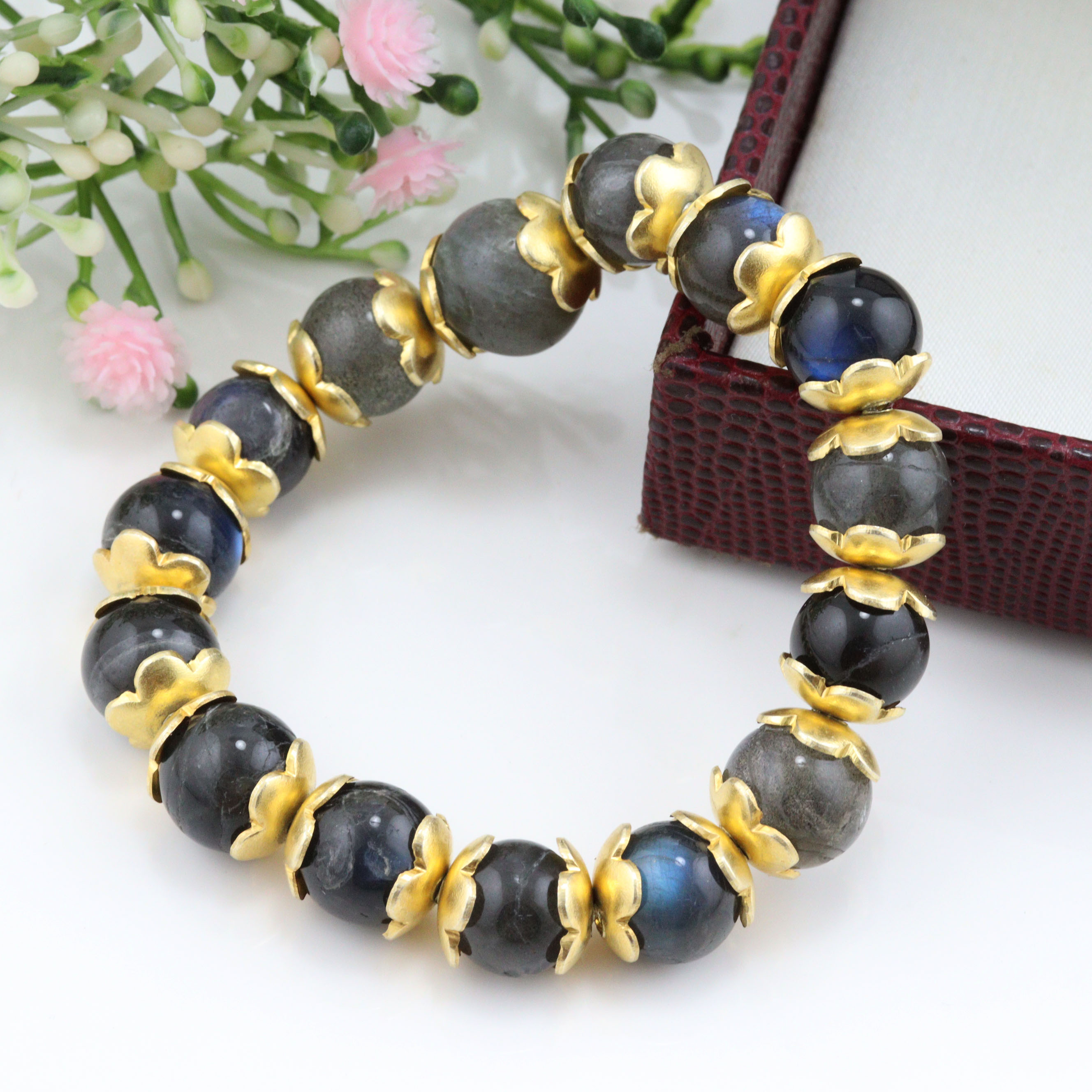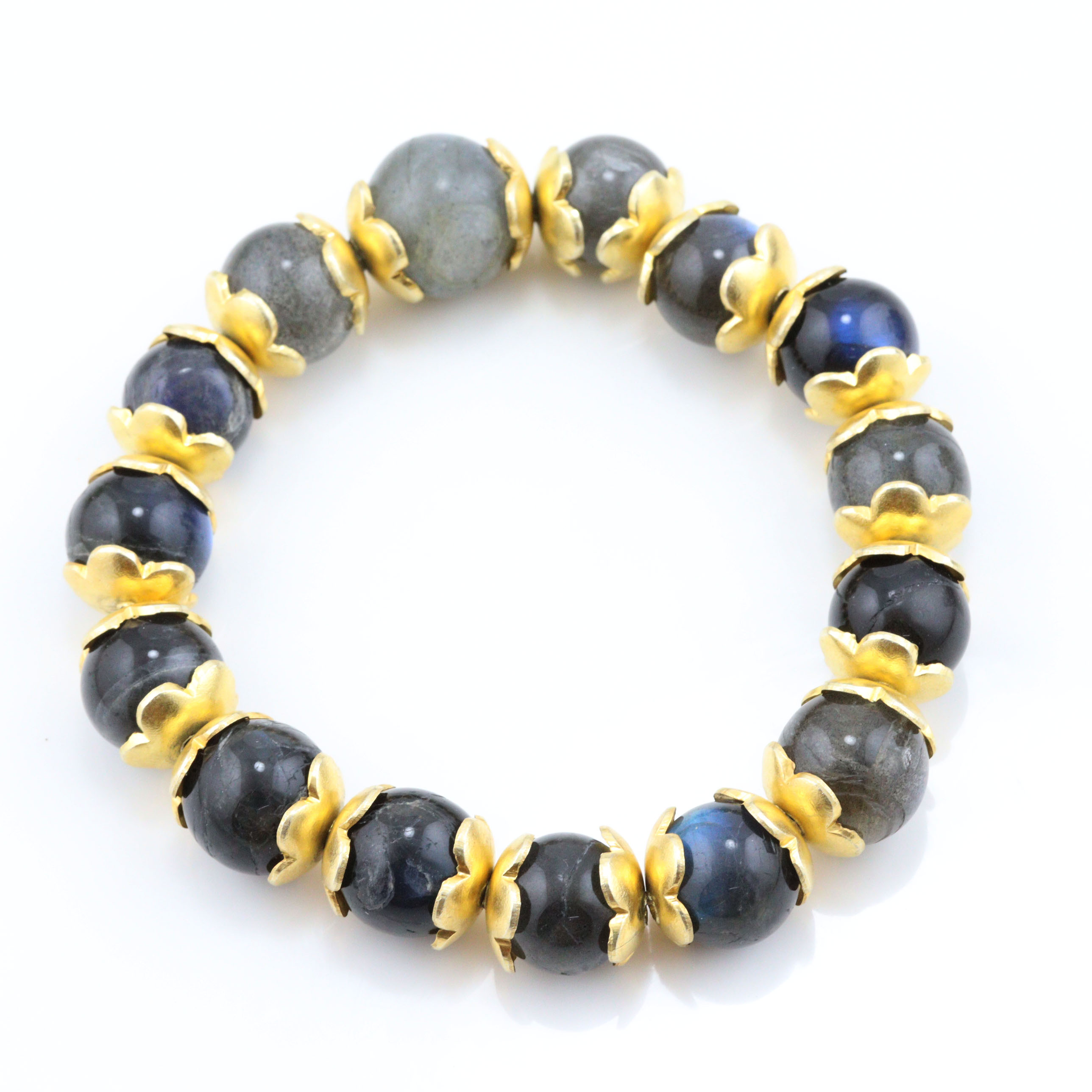 Avoid moisture and store it separately to preserve the gold-toned brass and maintain the labradorite’s natural sheen.
